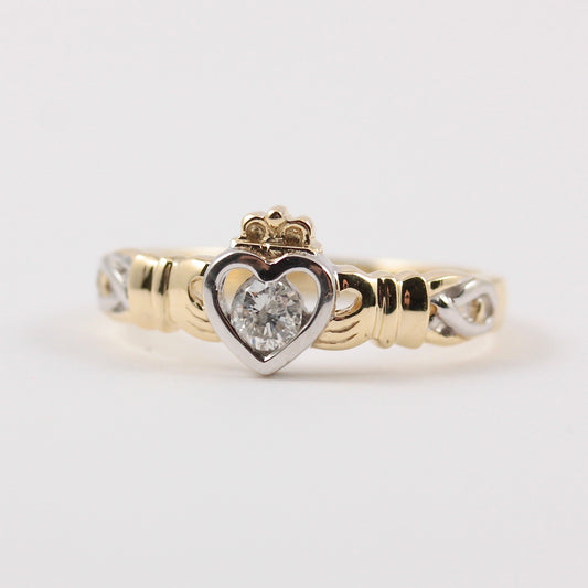 Pre-owned 9ct Yellow and White Gold Claddagh Ring with Diamond