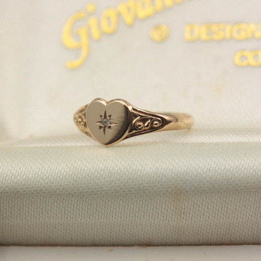 Small Pre-owned 9ct Gold and Diamond Heart Signet Ring, Size G 1/2