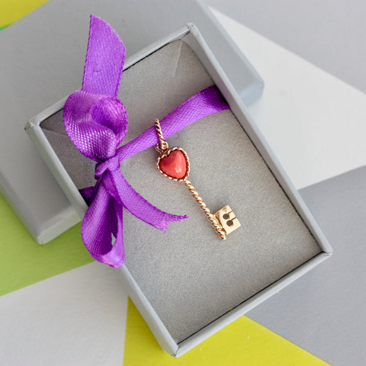 Vintage 9ct Gold and Coral Key Pendant, 1977