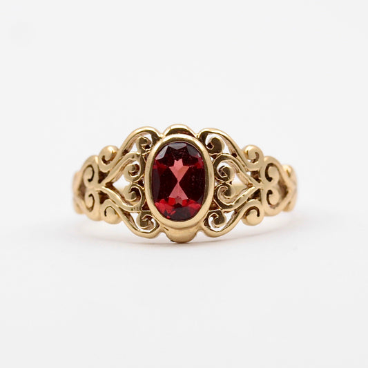Vintage 9ct Gold and Garnet Scroll Design Ring