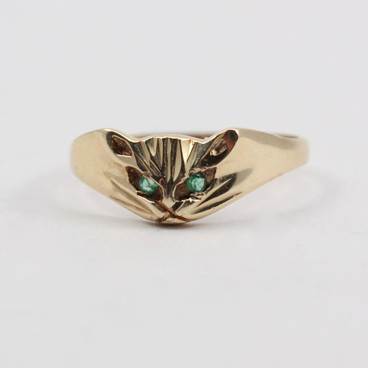 Vintage 9ct Gold Cat Ring with Emerald Eyes, 1988