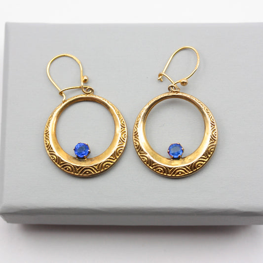 Vintage 9ct Gold Dangle Hoop Earrings with Blue Crystal, 1976