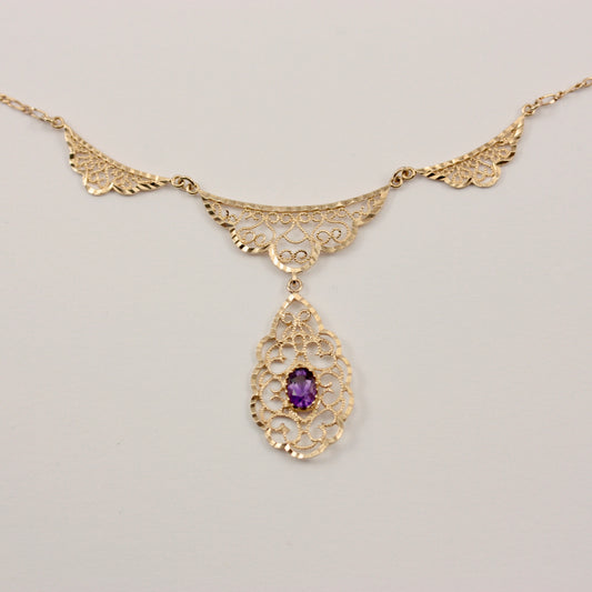 Vintage 9ct Gold Filigree Panel Necklace with Amethyst, 1994
