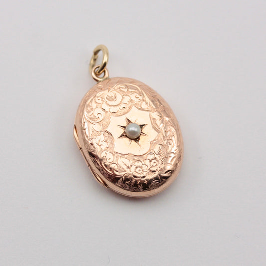 Antique 9ct Gold Fully Engraved Locket with Star Set Pearl, 1903