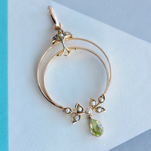 Antique 9ct Gold Peridot and Seed Pearl Lavalier Pendant