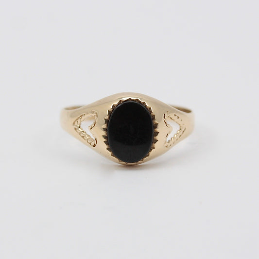 Vintage 9ct Gold Onyx Signet Ring with Heart Cut Out Shoulders, 1981