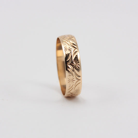 Vintage 9ct Gold Patterned Wedding Ring with Leaf Design , 1979