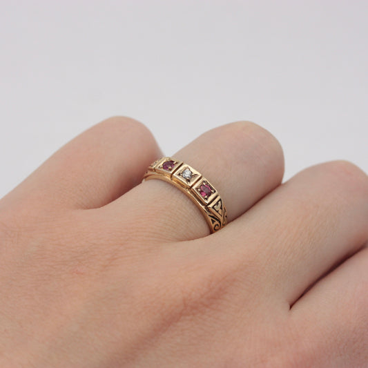 Vintage 9ct Gold Ruby & Diamond 3 Stone Band Ring, 1979