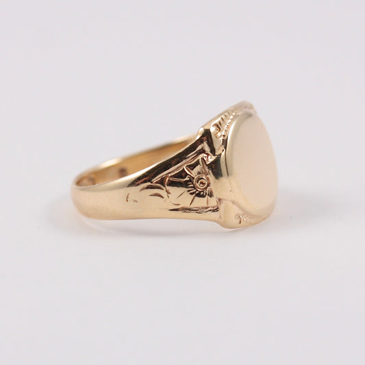Vintage 9ct Gold Round Blank Signet Ring with Floral Shoulders, 1947