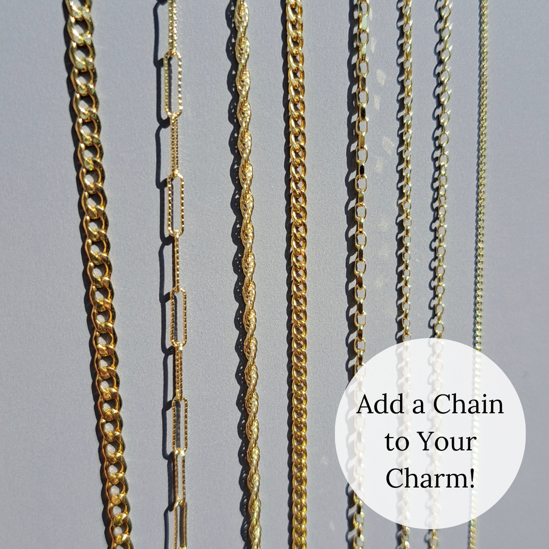 Charm pictured with our standard 0.8mm wide belcher chain. View more chain options here