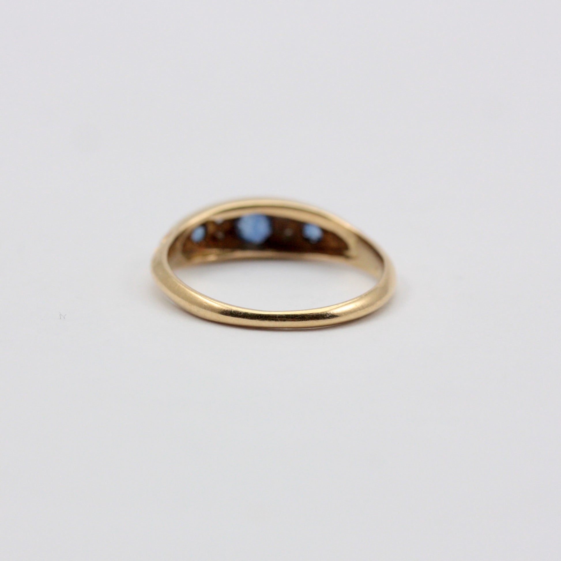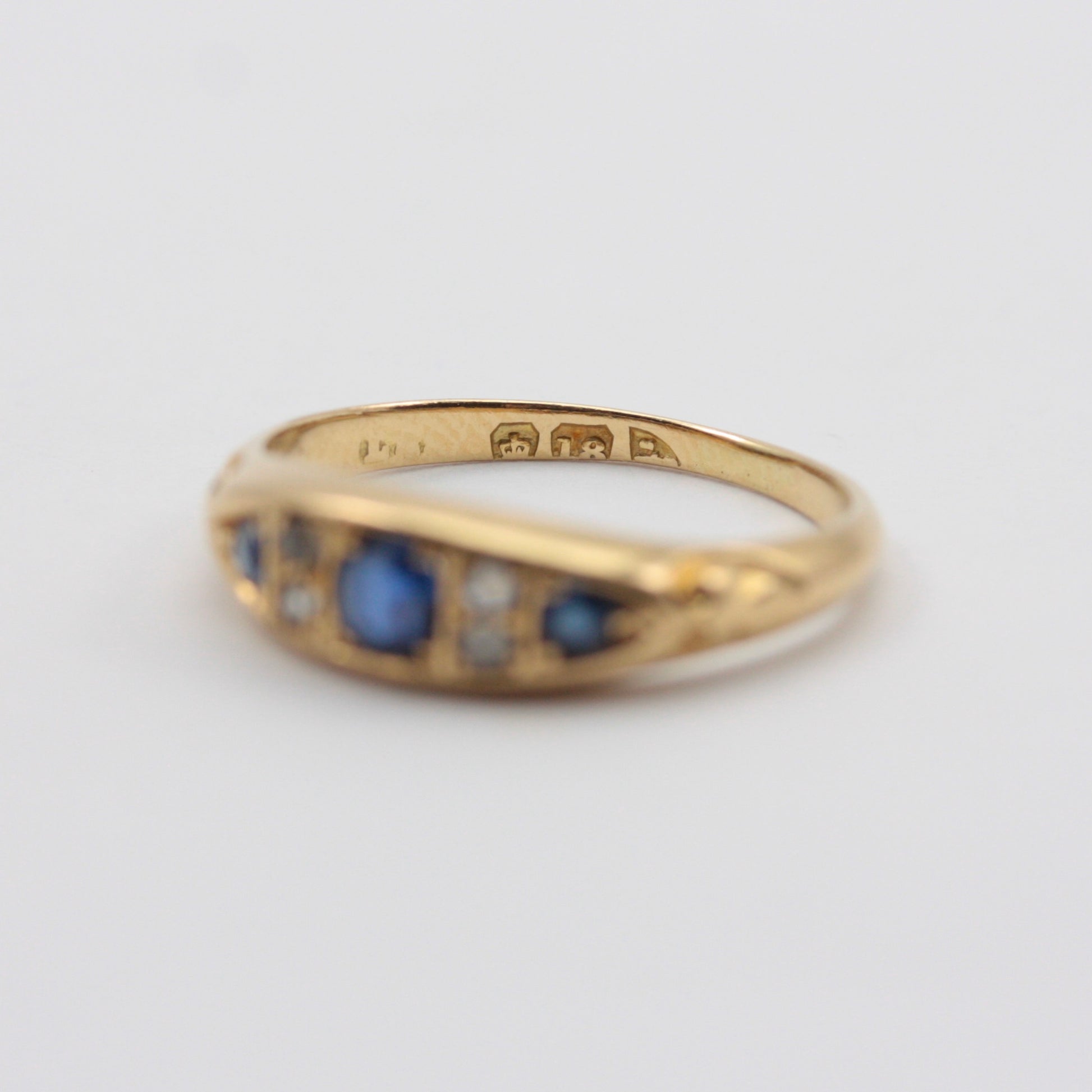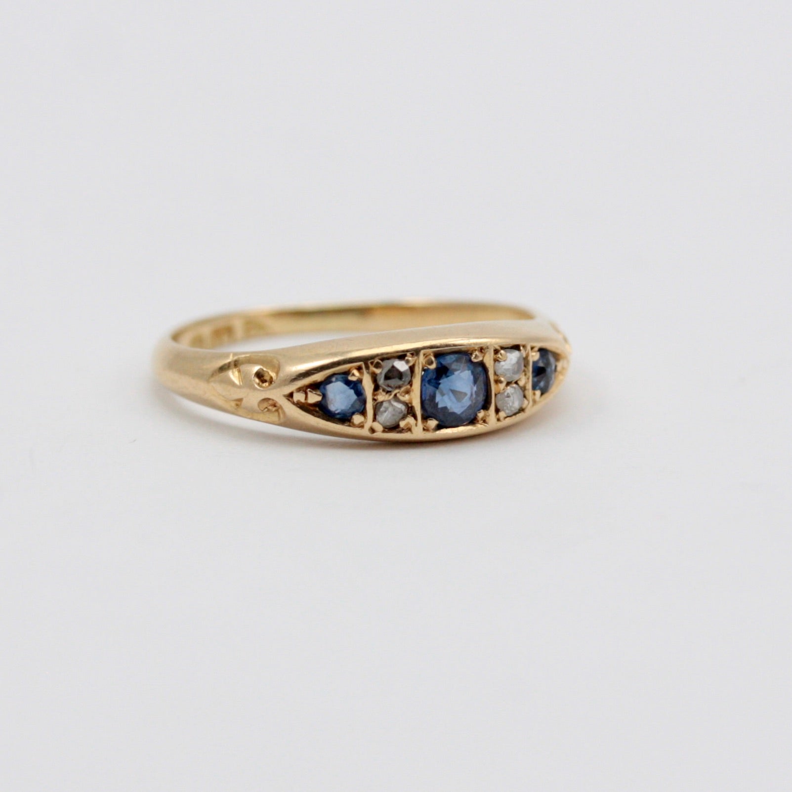 A lovely little antique solid 18ct yellow gold boat ring with three nicely coloured sapphires and four small diamonds.