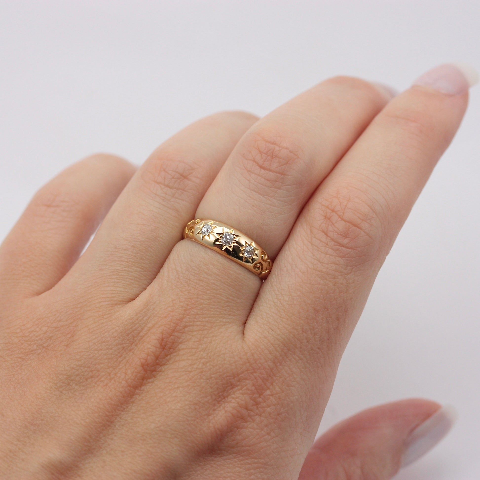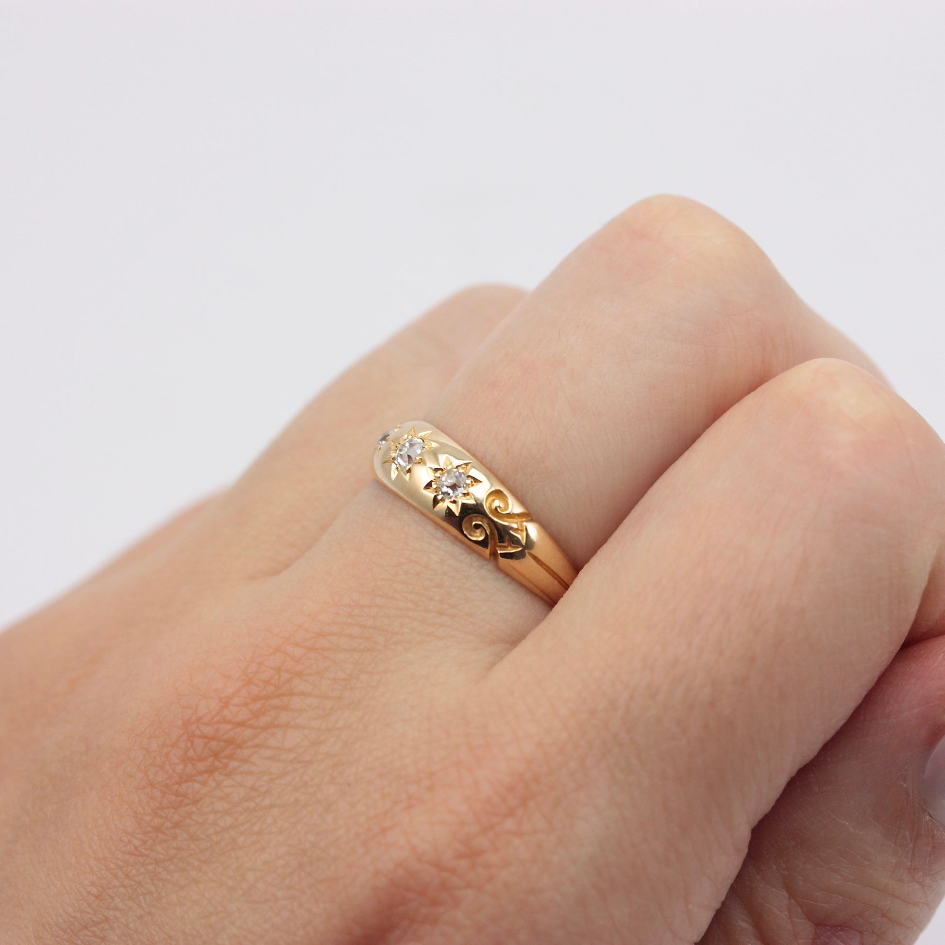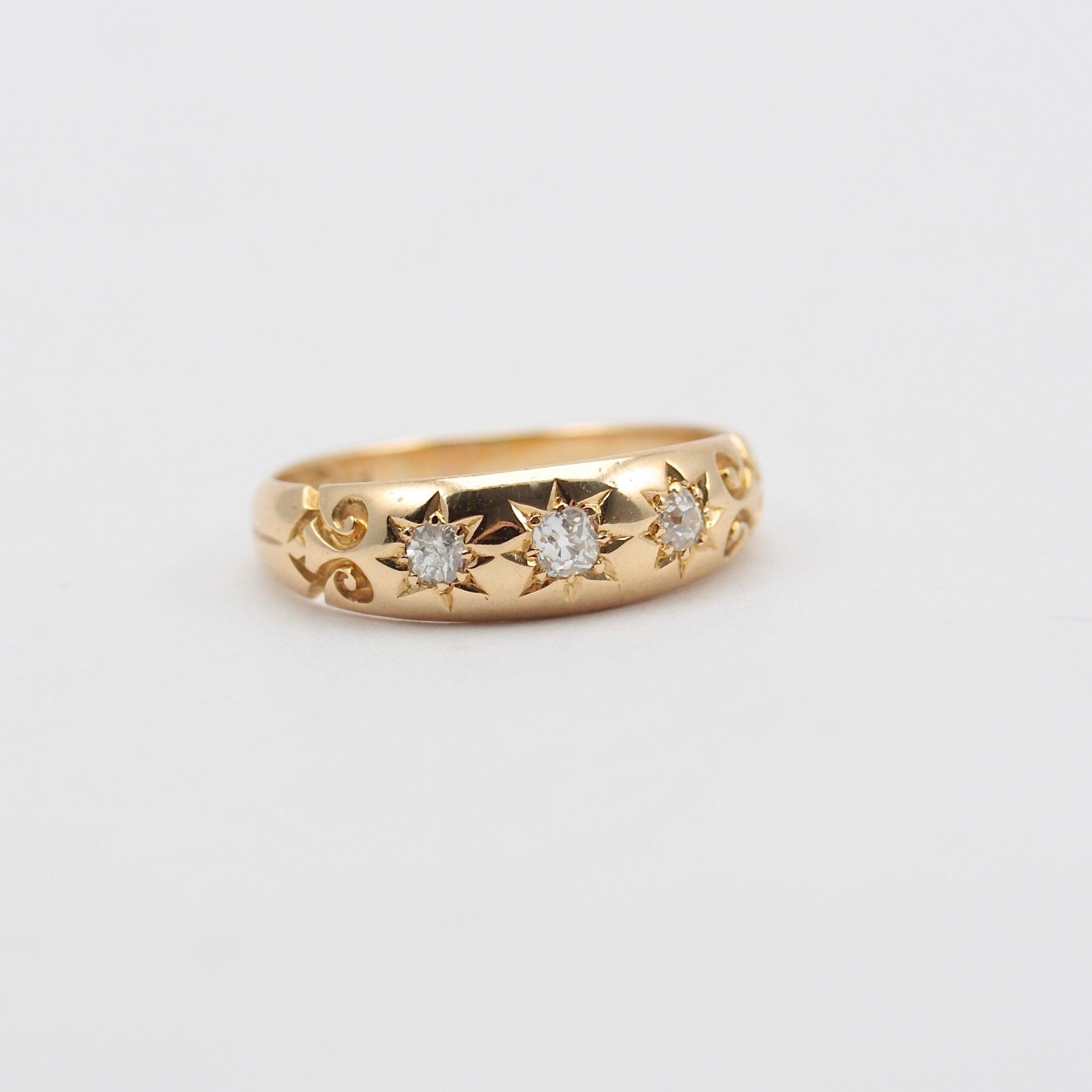 A late Victorian solid 18ct yellow gold ring with three sparkling star set diamonds.