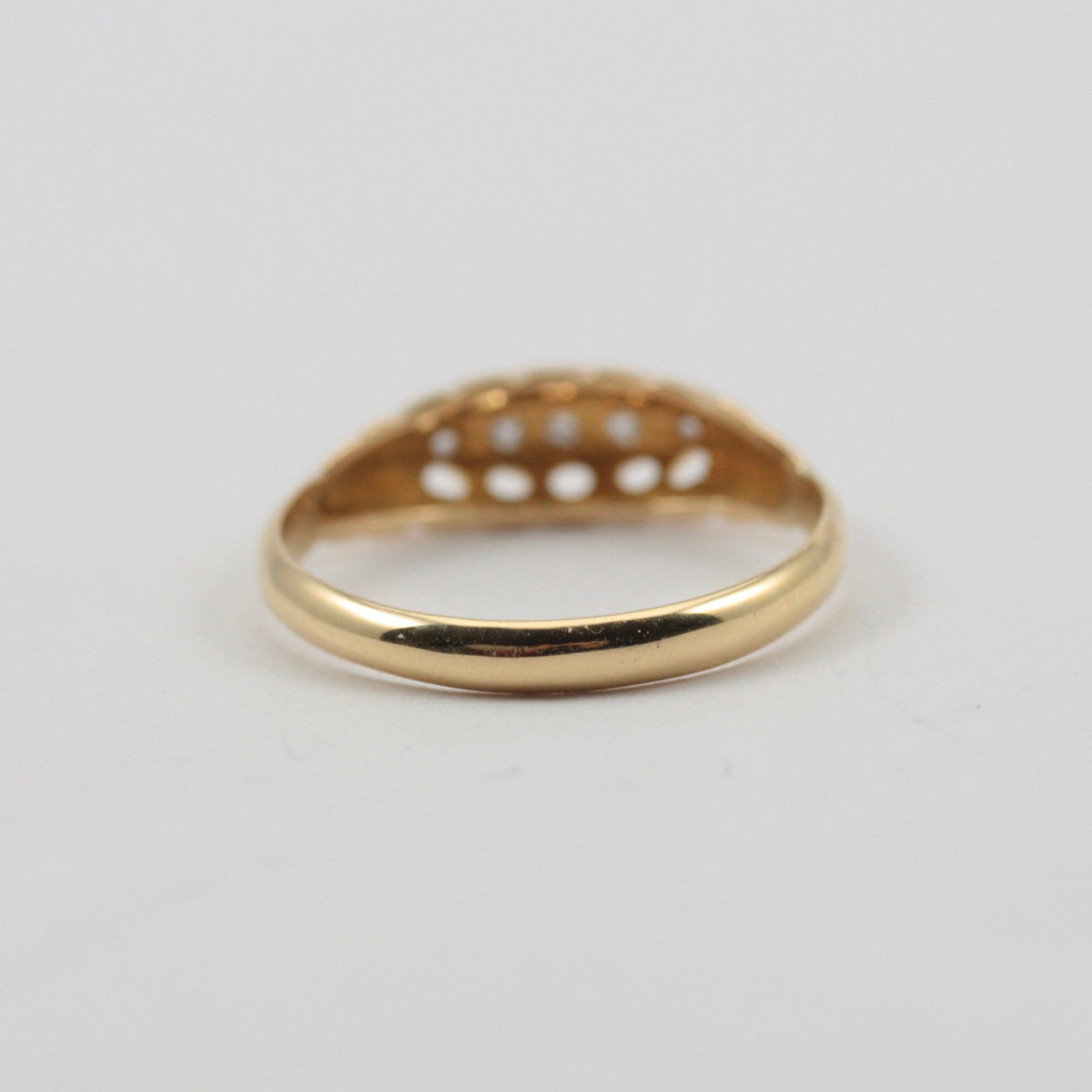 An antique Edwardian 18ct gold boat ring with 5 tiny diamond chips.