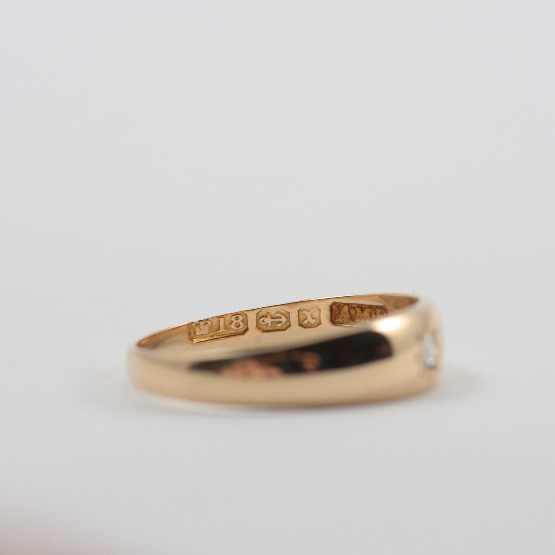 Hallmarks: Crown, '18', Birmingham, 'X' for 1897, 'A.M.B' (Possibly for Abraham Meyer Blanckensee).
