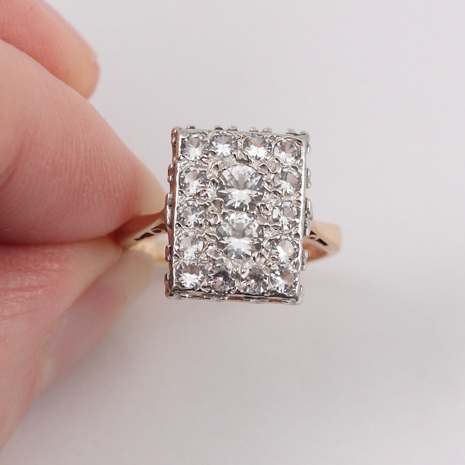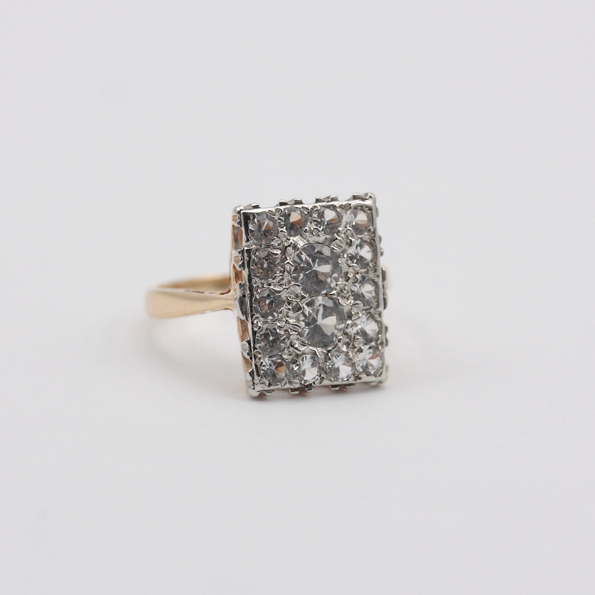 A gorgeous Art Deco era, solid 9ct yellow gold plaque ring set with rock crystals.