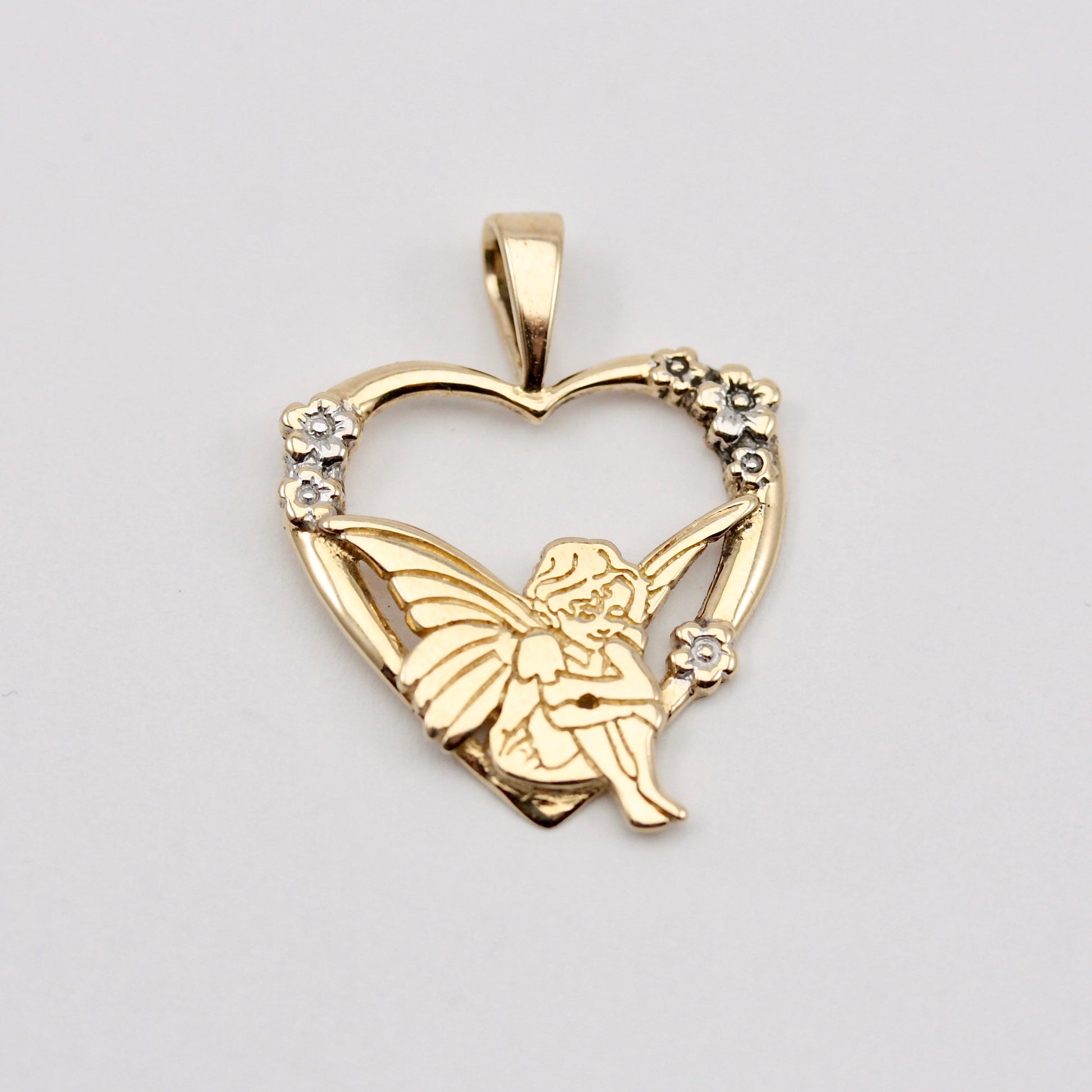 A 9ct yellow gold heart pendant with white gold flowers and central fairy design.