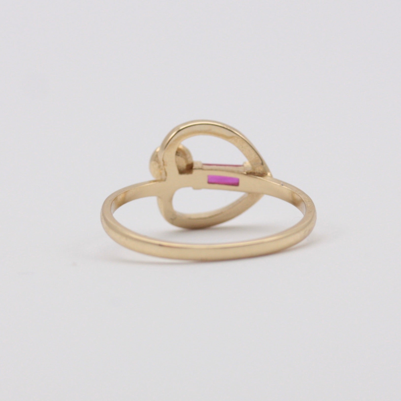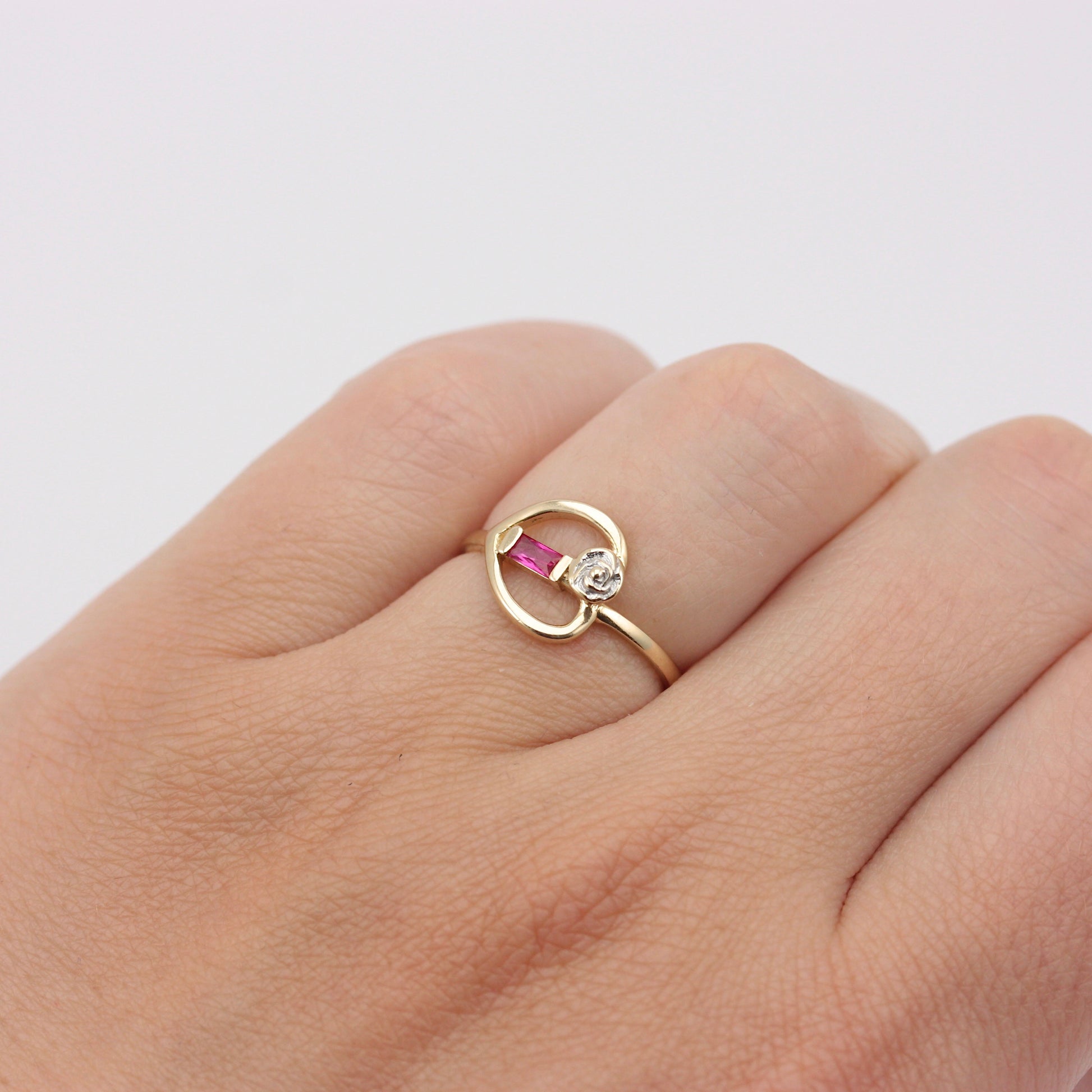 A pre-owned 14K gold ring in an Art Nouveau style featuring open heart design, white gold rose and baguette cut pink topaz.