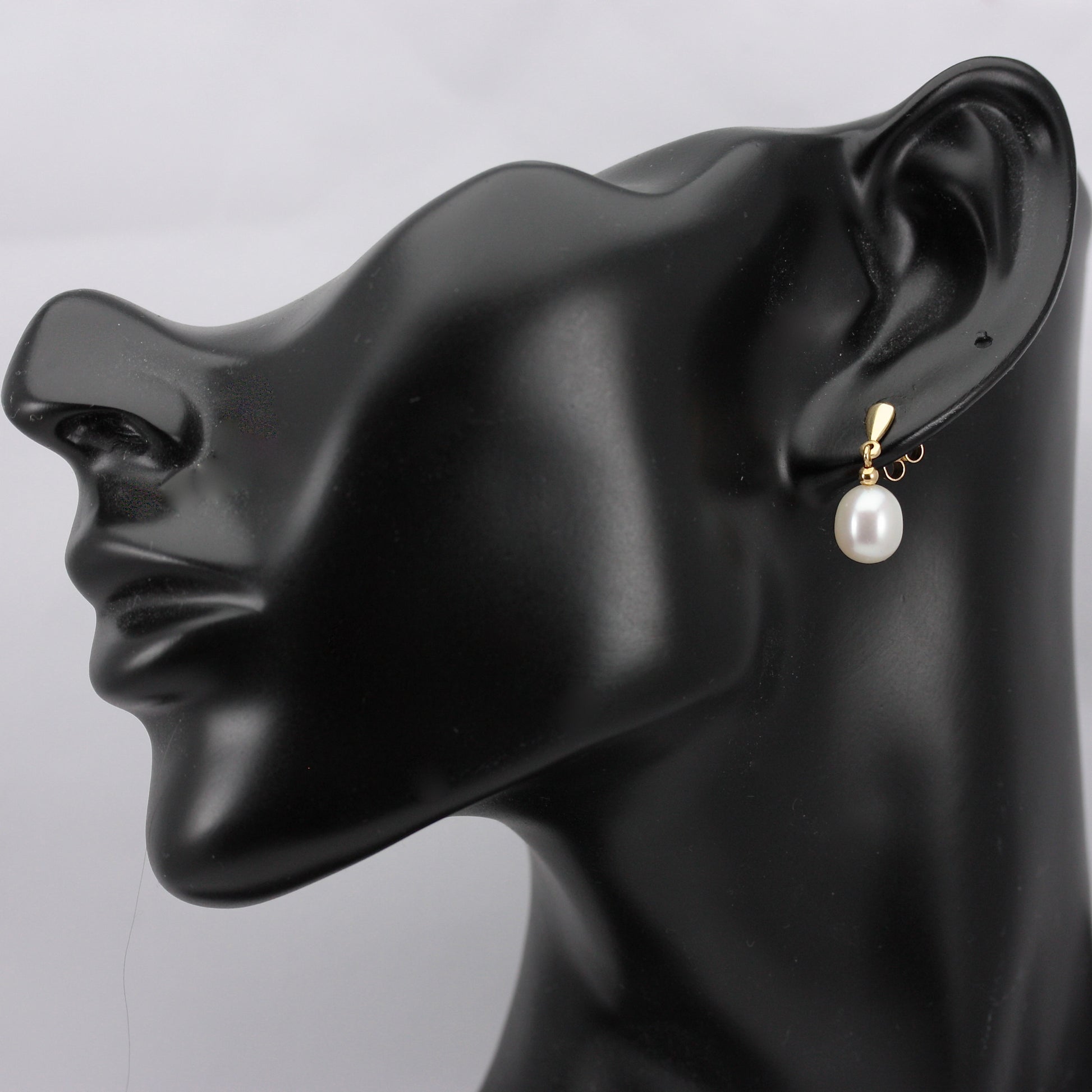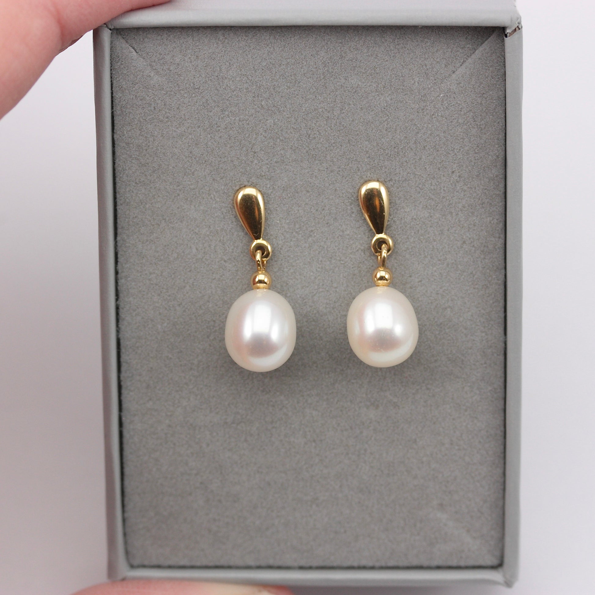 A lovely pair of 18ct yellow gold dangle earrings with nice sized cultured freshwater pearls. They come gift boxed.