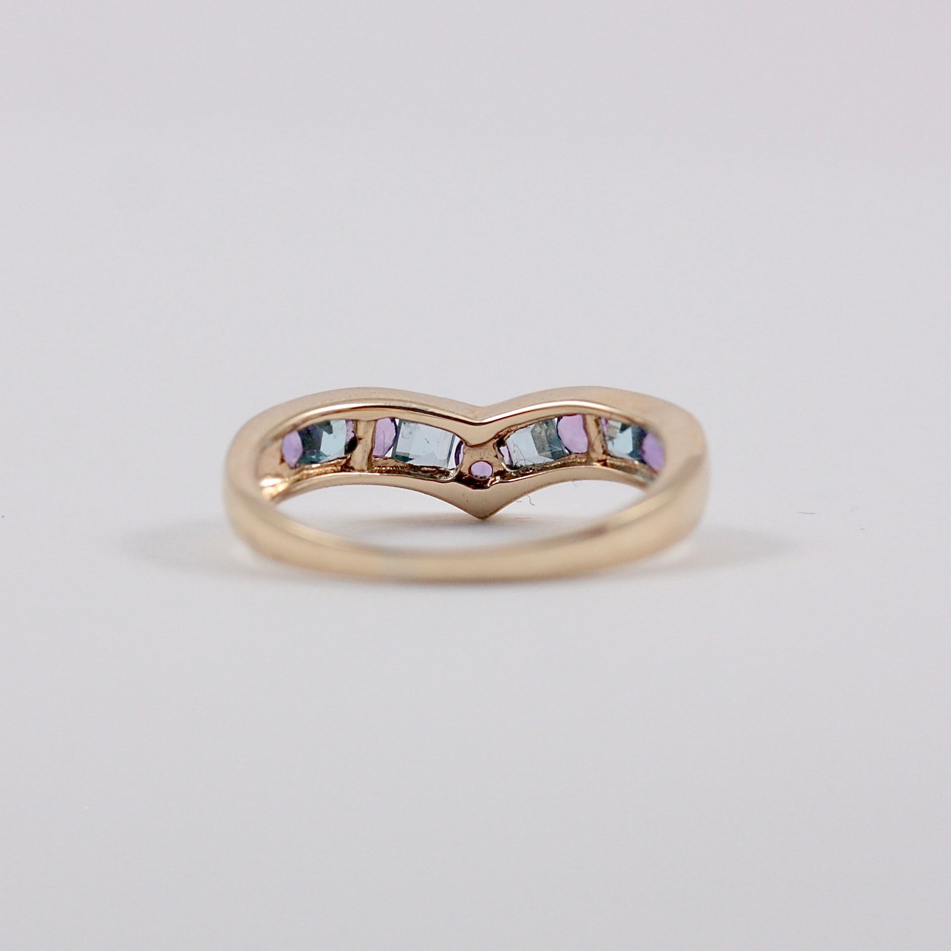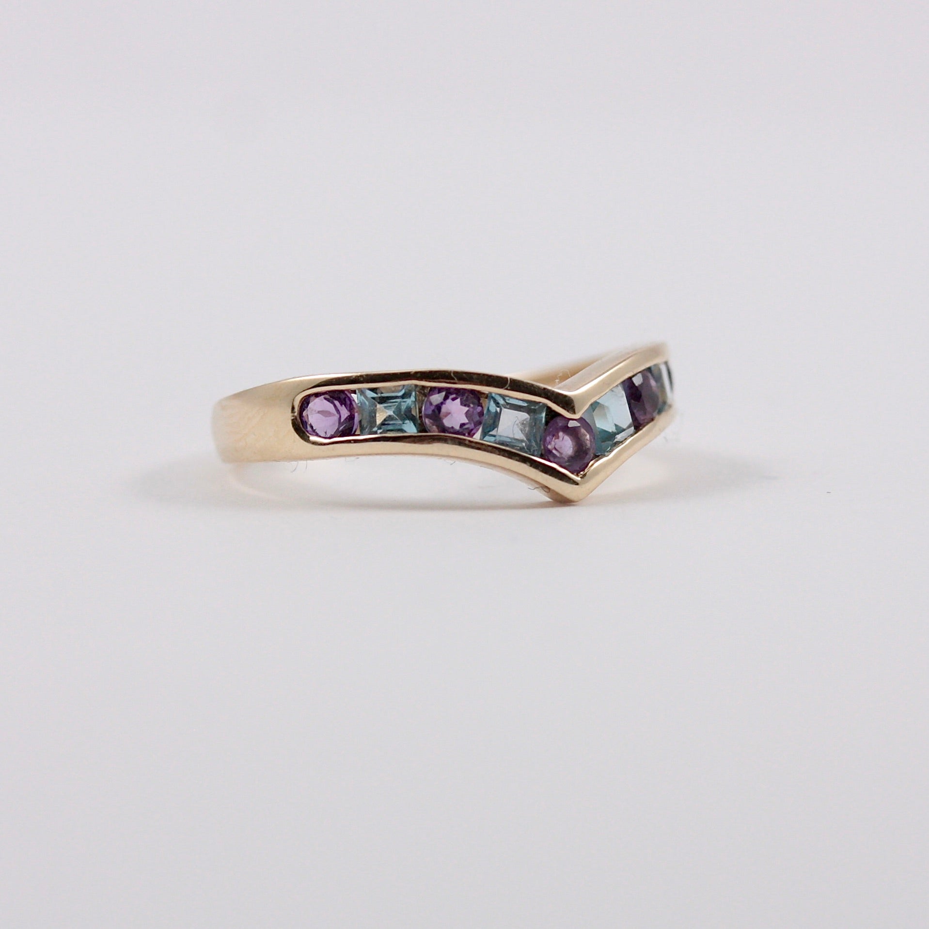 A pretty, solid 9ct yellow gold wishbone ring with alternating round amethyst and square topaz.