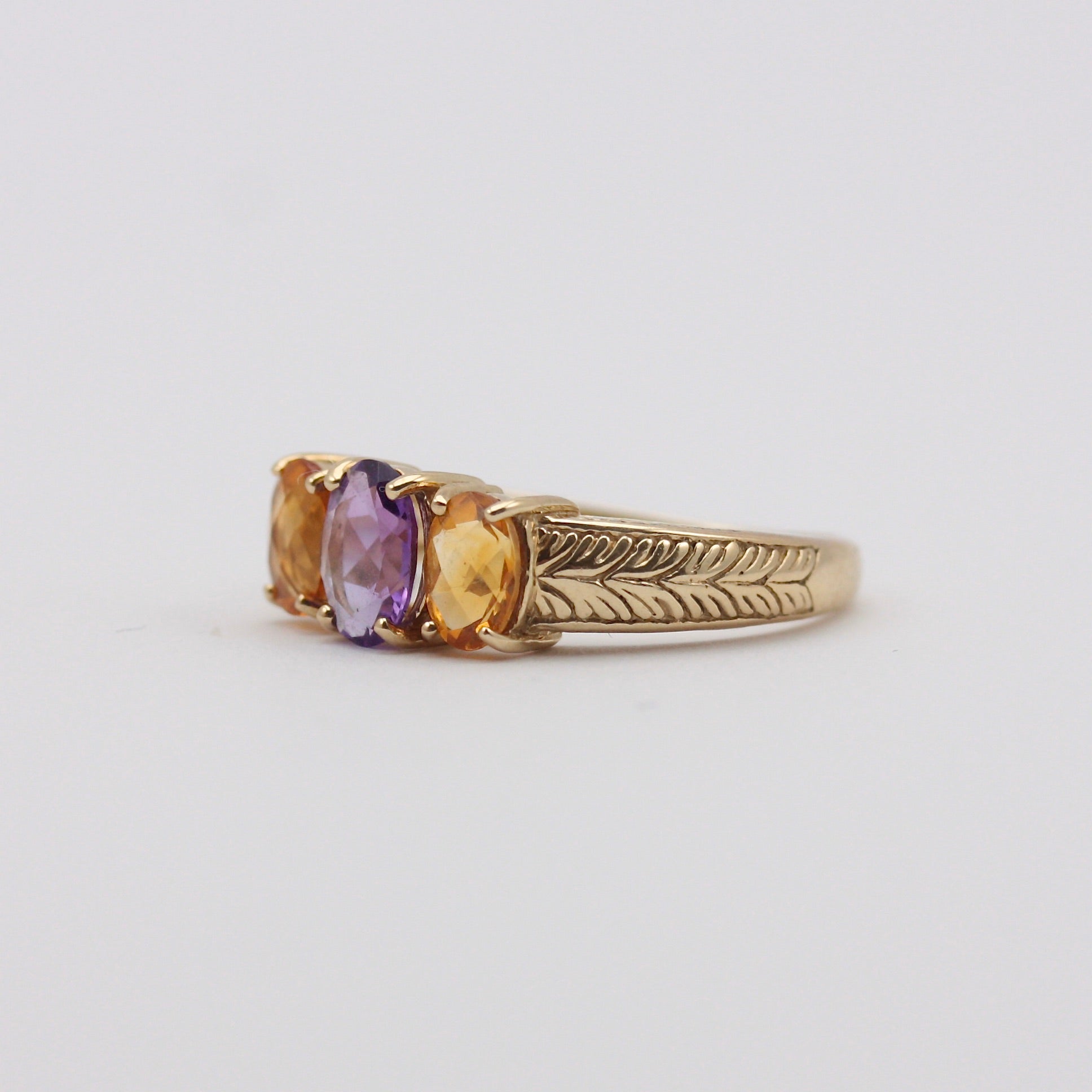 A lovely solid 9ct yellow gold ring with amethyst and citrine and decorative shoulders.