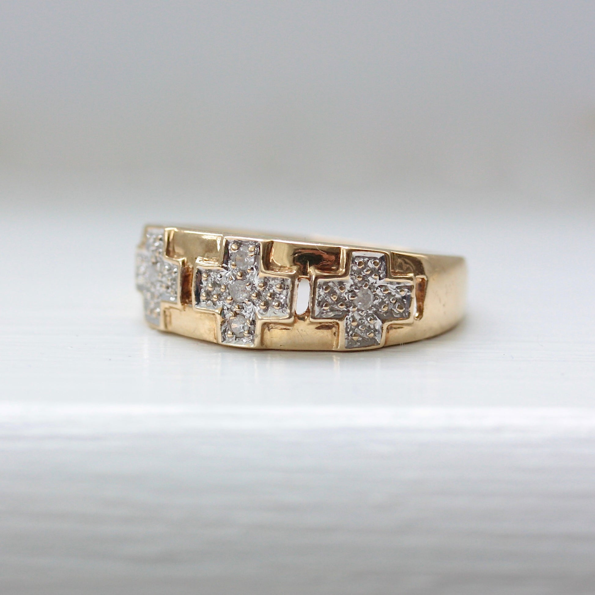 A lovely solid 9ct yellow gold band style ring featuring three crosses. The outer two crosses are set with one small diamond each and the centre cross is set with three small diamonds.