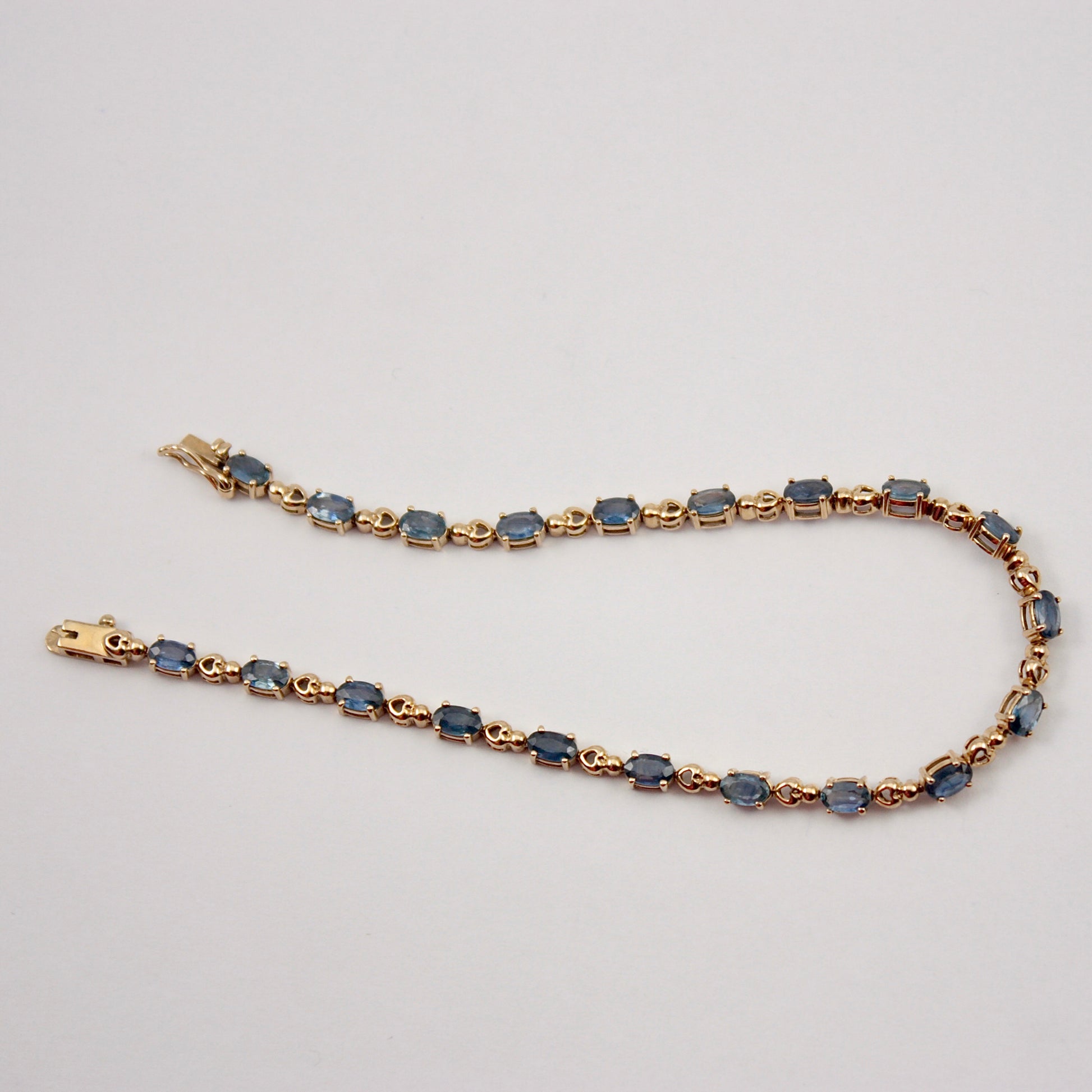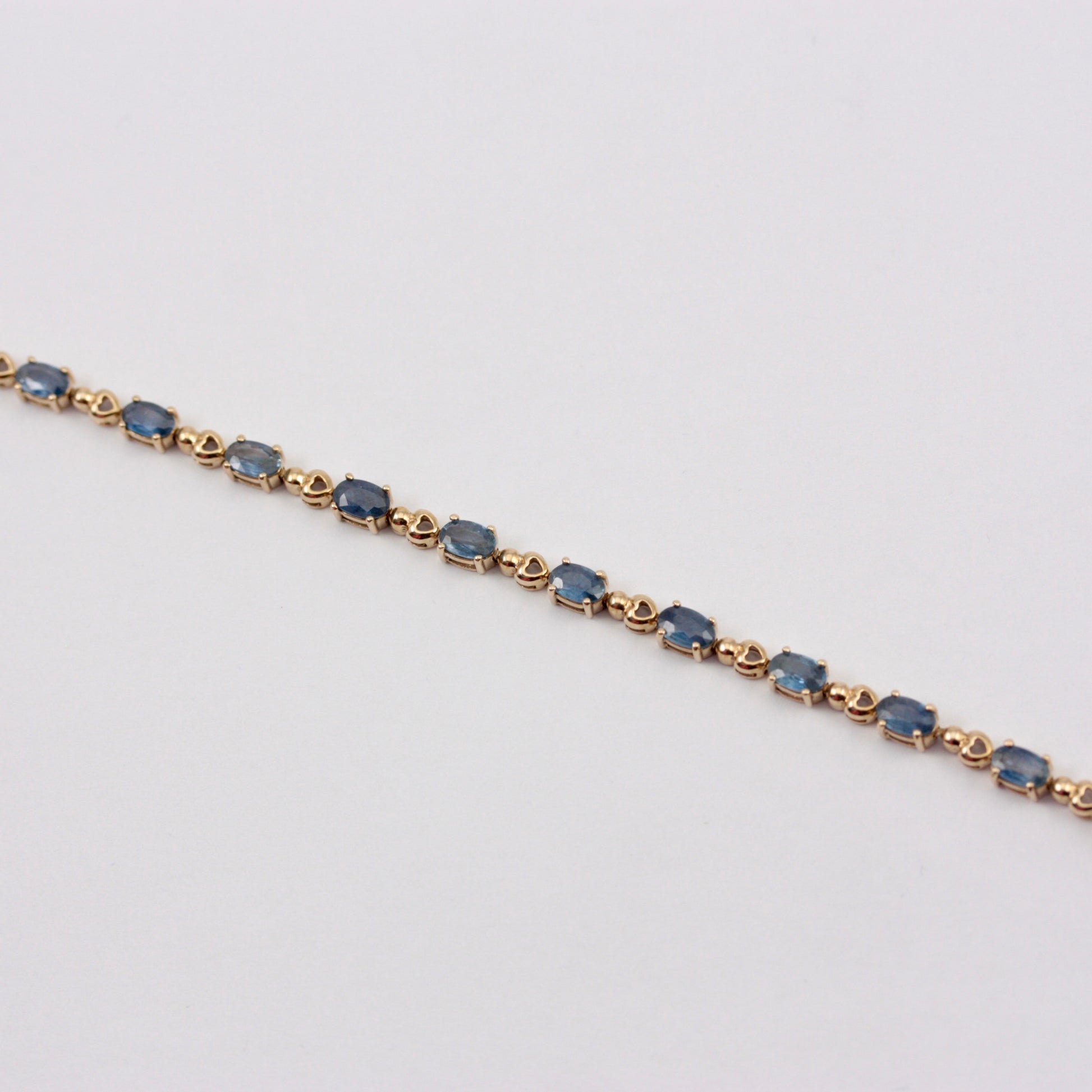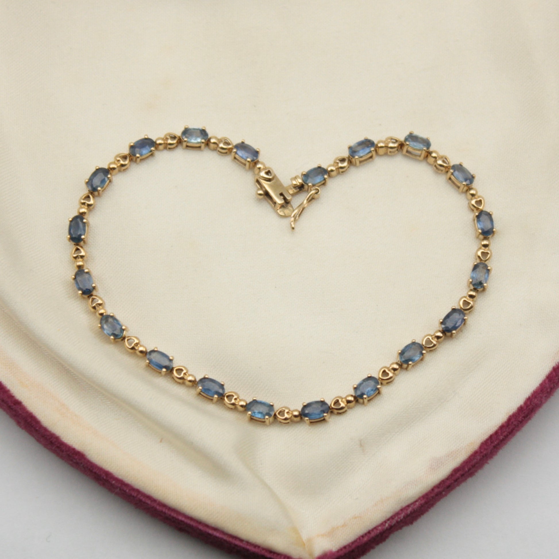 A pre-owned 9ct gold bracelet with oval cut natural sapphires and little open heart links between each stone.