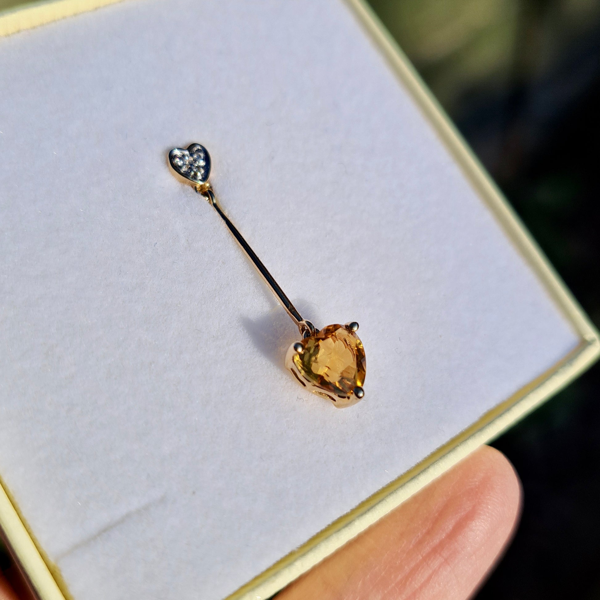 A pretty 9ct yellow gold drop style pendant with heart cut citrine to the end and three small diamonds encrusted in the top heart.
