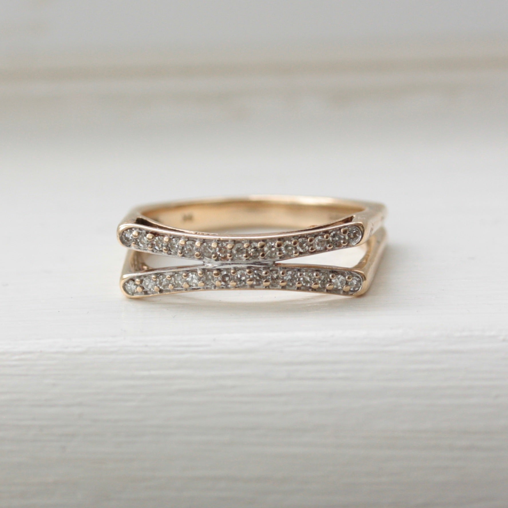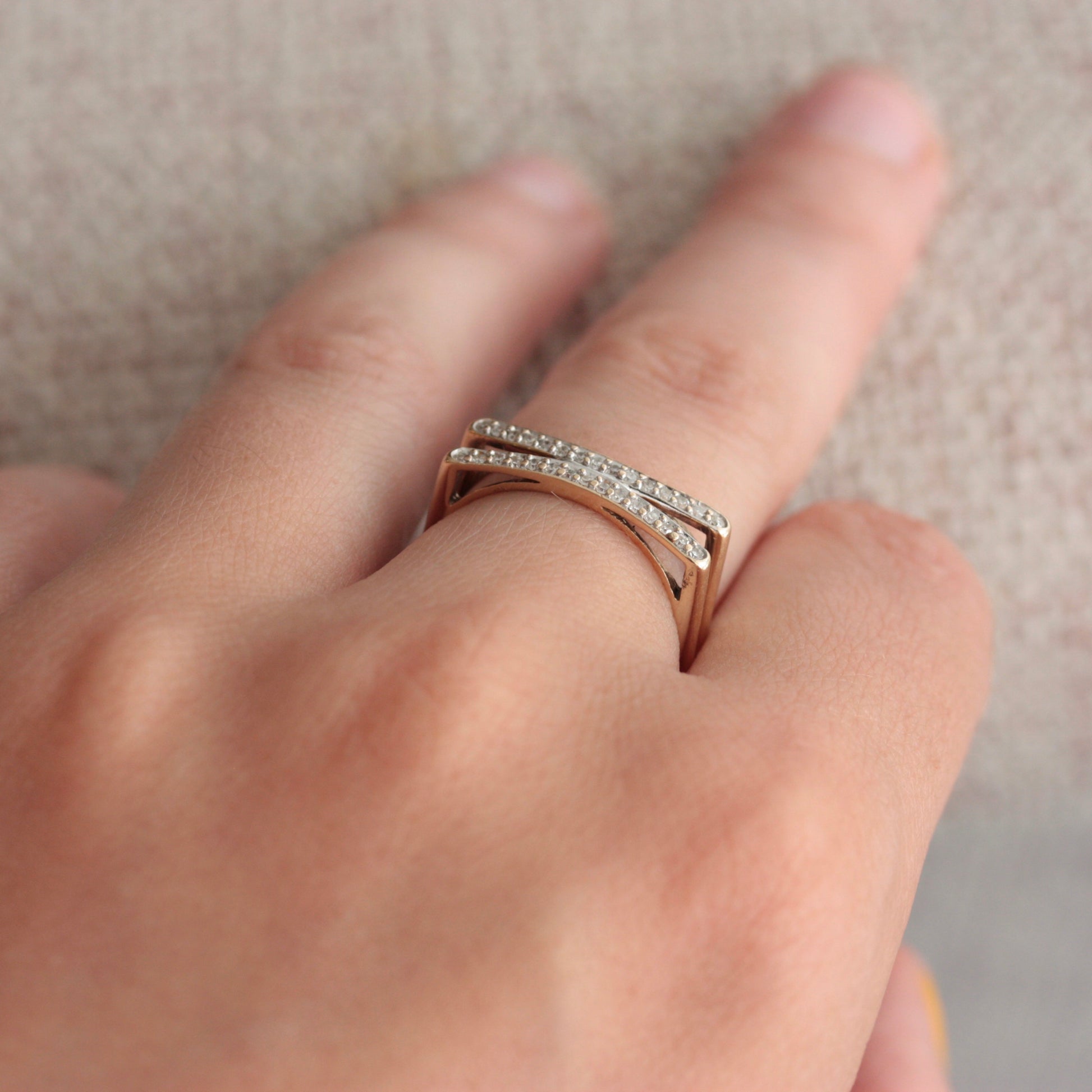 A really fun solid 9ct yellow gold and diamond ring, in a split flat fronted style with squared sides, yet is still very comfortable to wear as it is round on the inside.