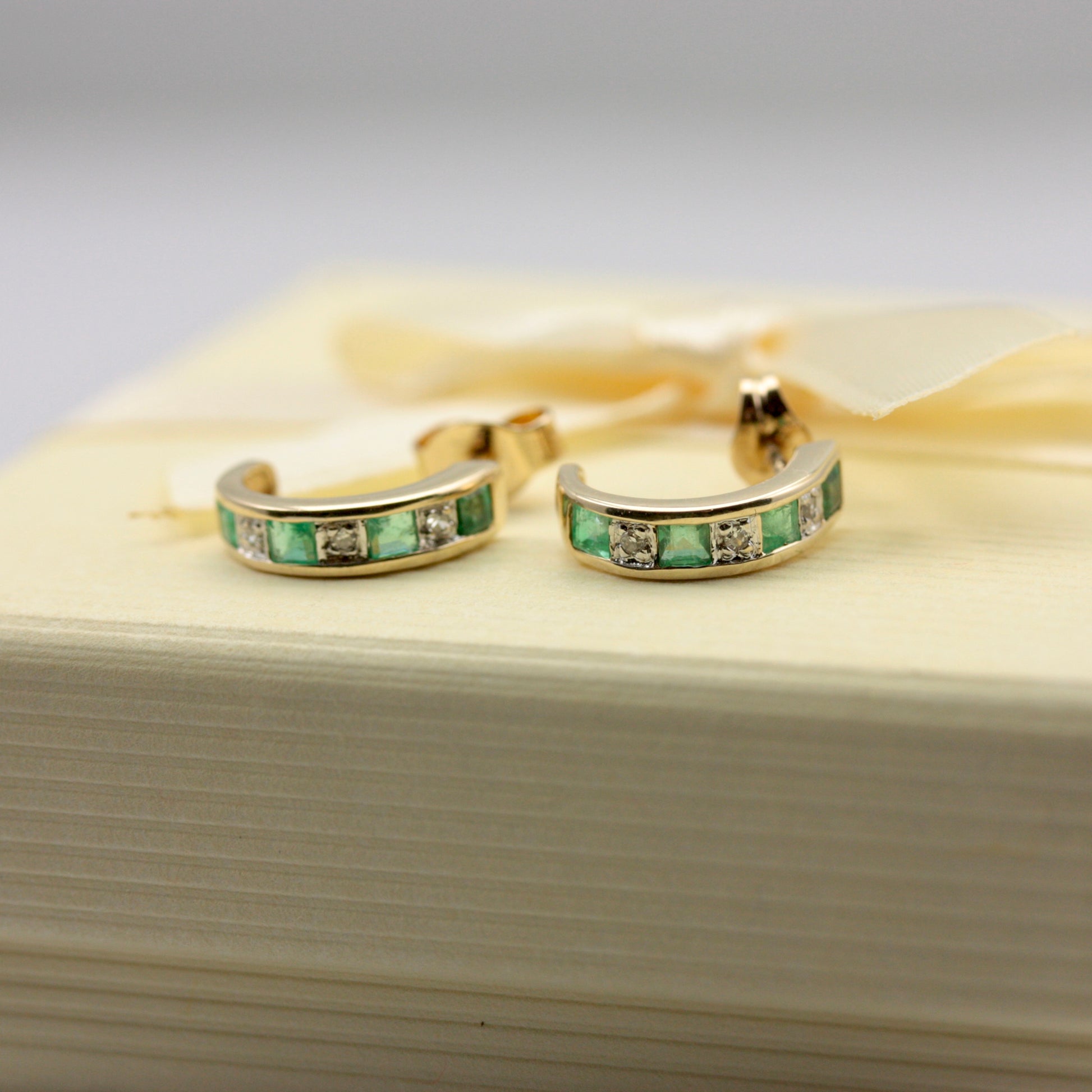 A pretty pair of 9ct yellow gold half hoop earrings with emeralds and diamonds.