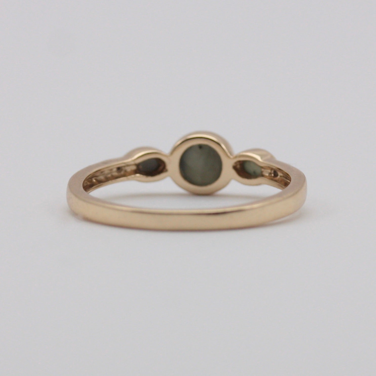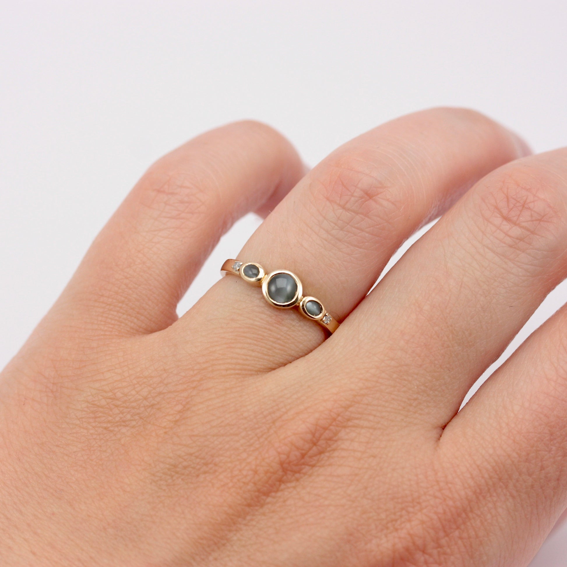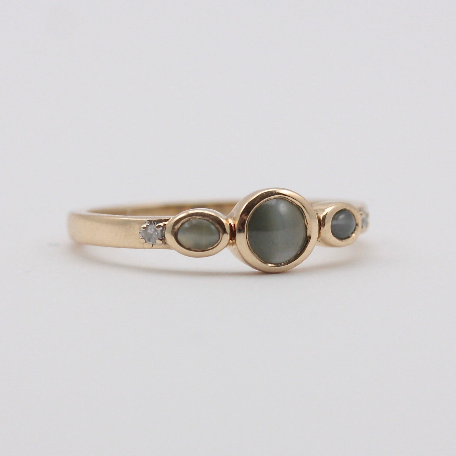 A dainty 9ct gold ring with three grey cats eye chrysoberyl and a tiny diamond to each shoulder.