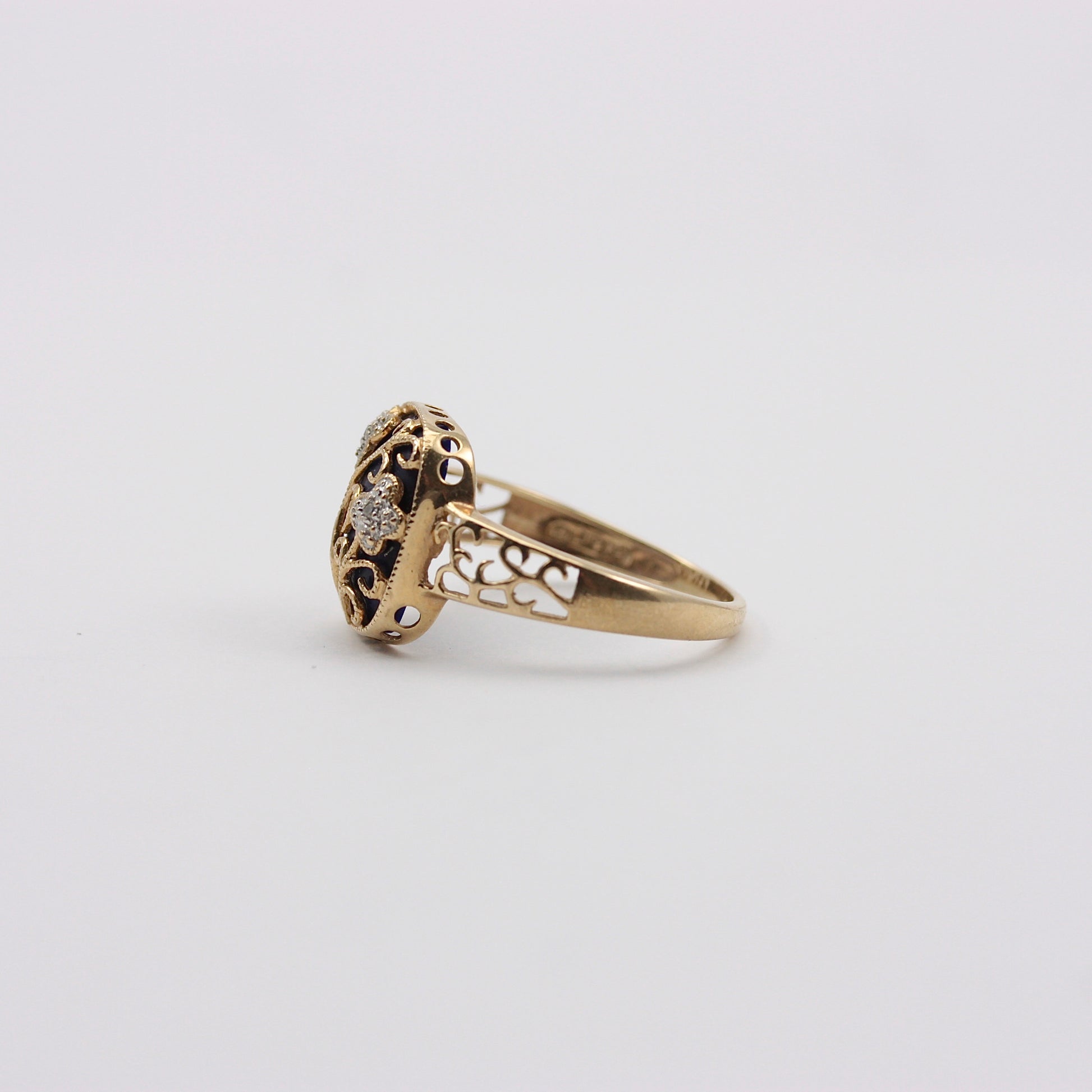 A 9ct yellow ring with lapis lazuli which sits behind filigree flowers, both set with a tiny diamond, and openwork shoulders.