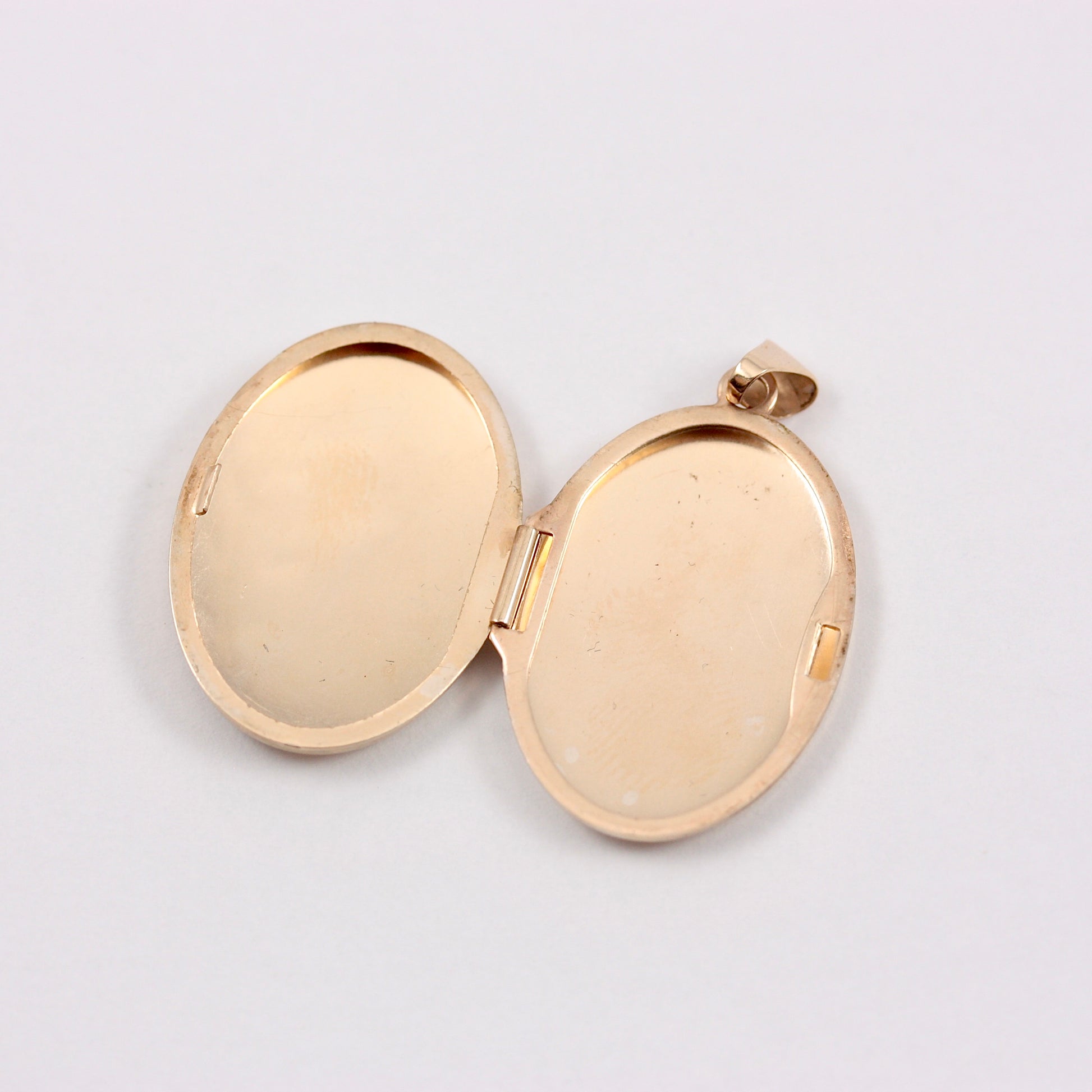 A solid 9ct yellow gold oval locket in contrasting matte and smooth finish with white gold floral details.