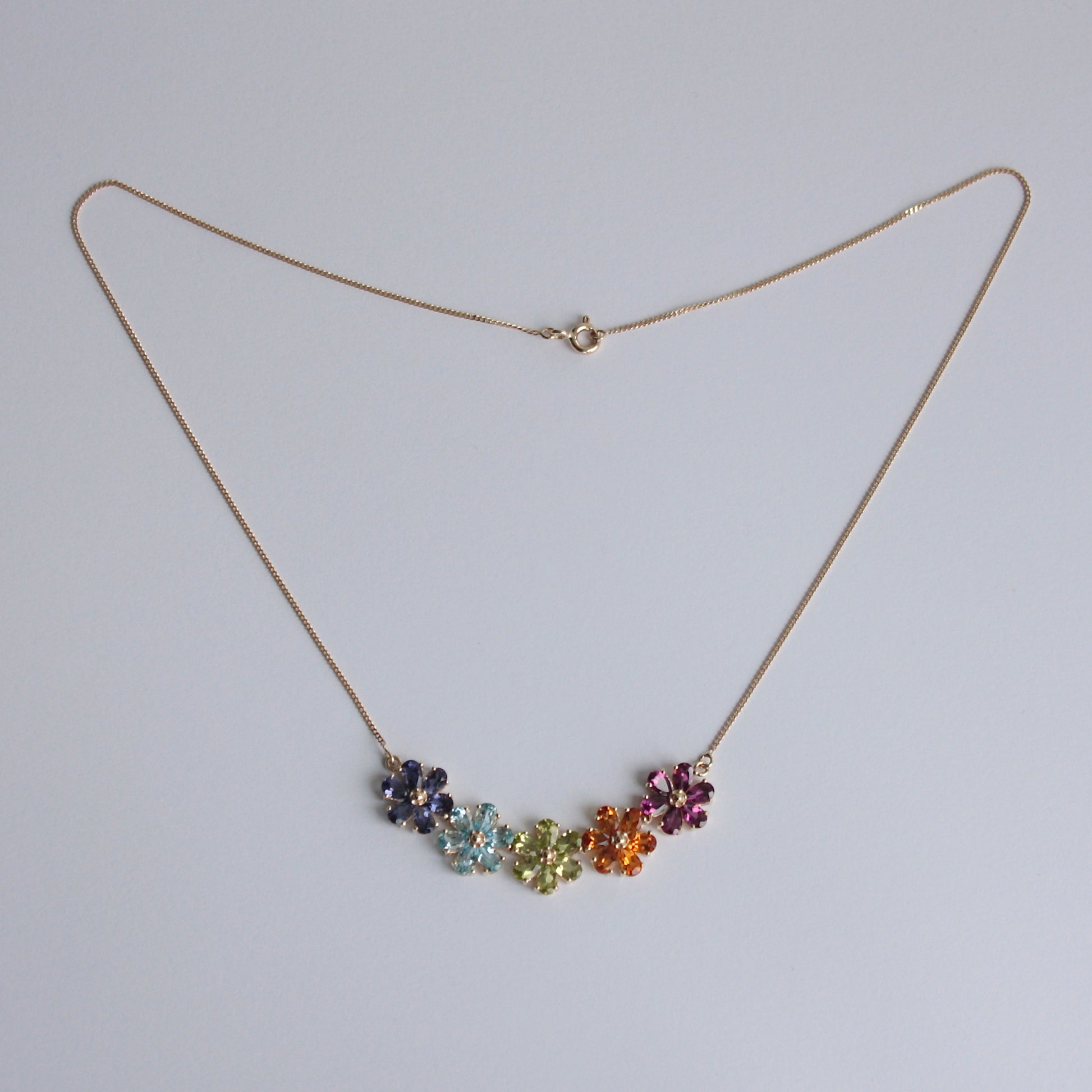 A pre-owned 9ct gold necklace with five gemstone flowers in iolite, blue topaz, peridot, citrine and rhodolite garnet.