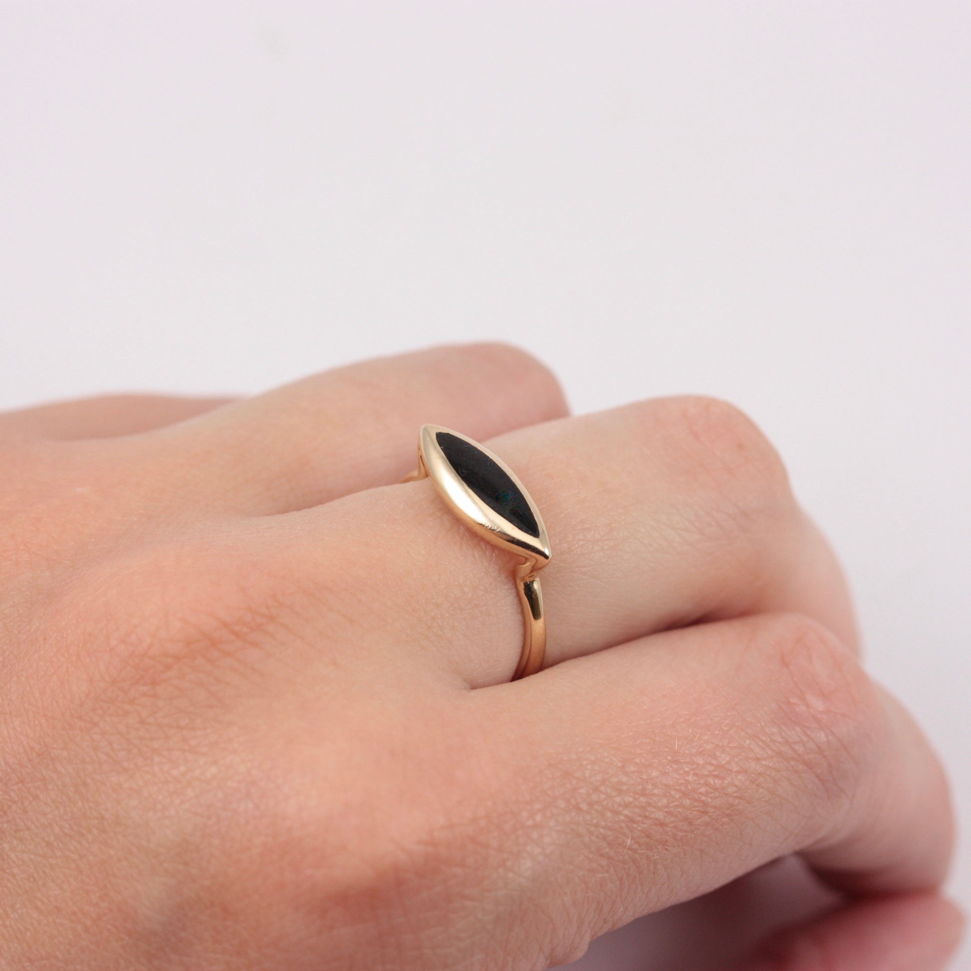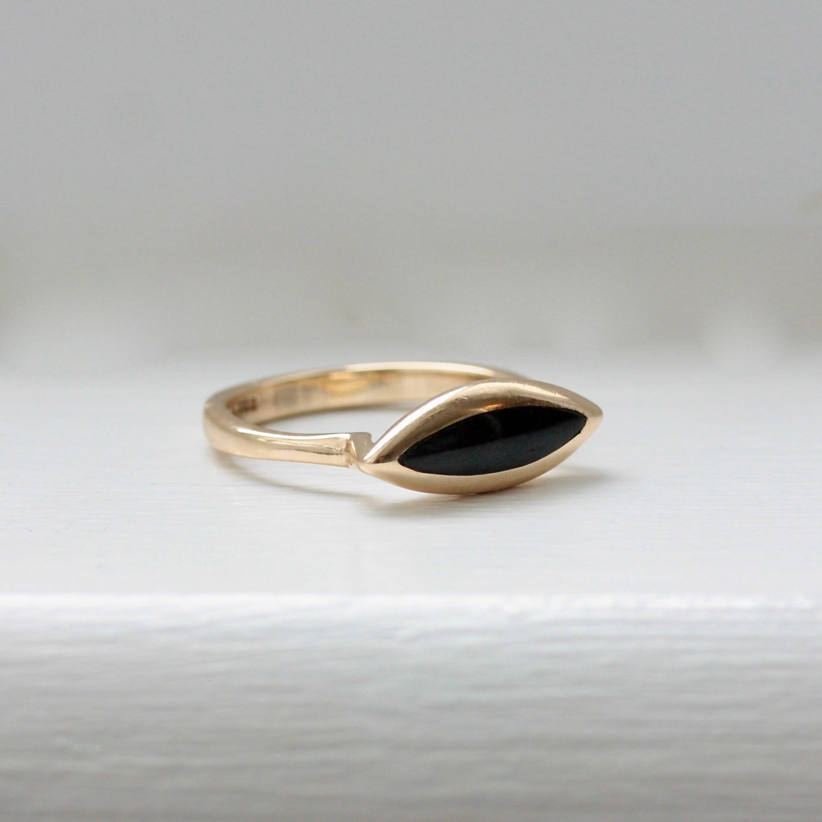 A lovely quality 9ct yellow gold ring set with an east / west facing dainty marquise shaped onyx.