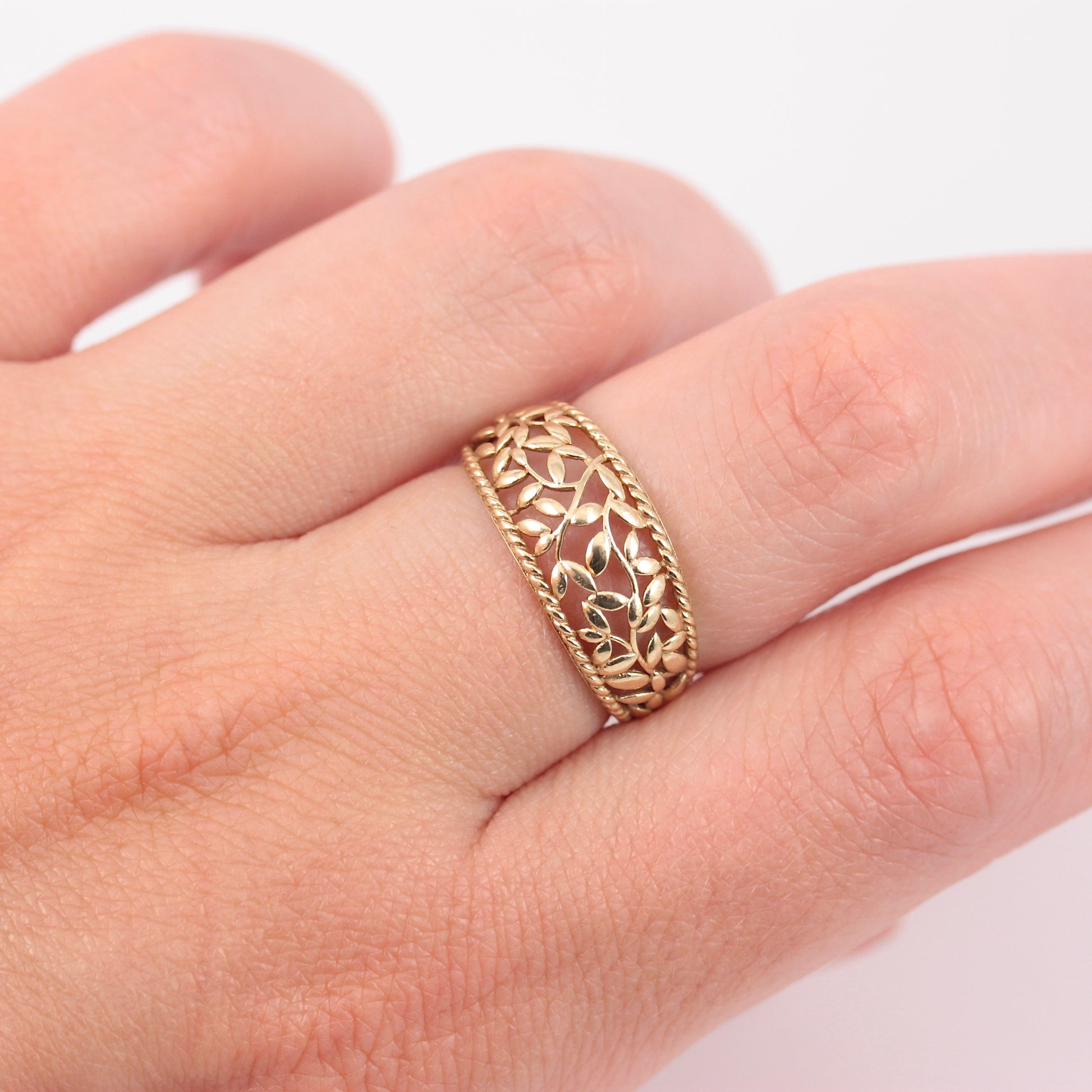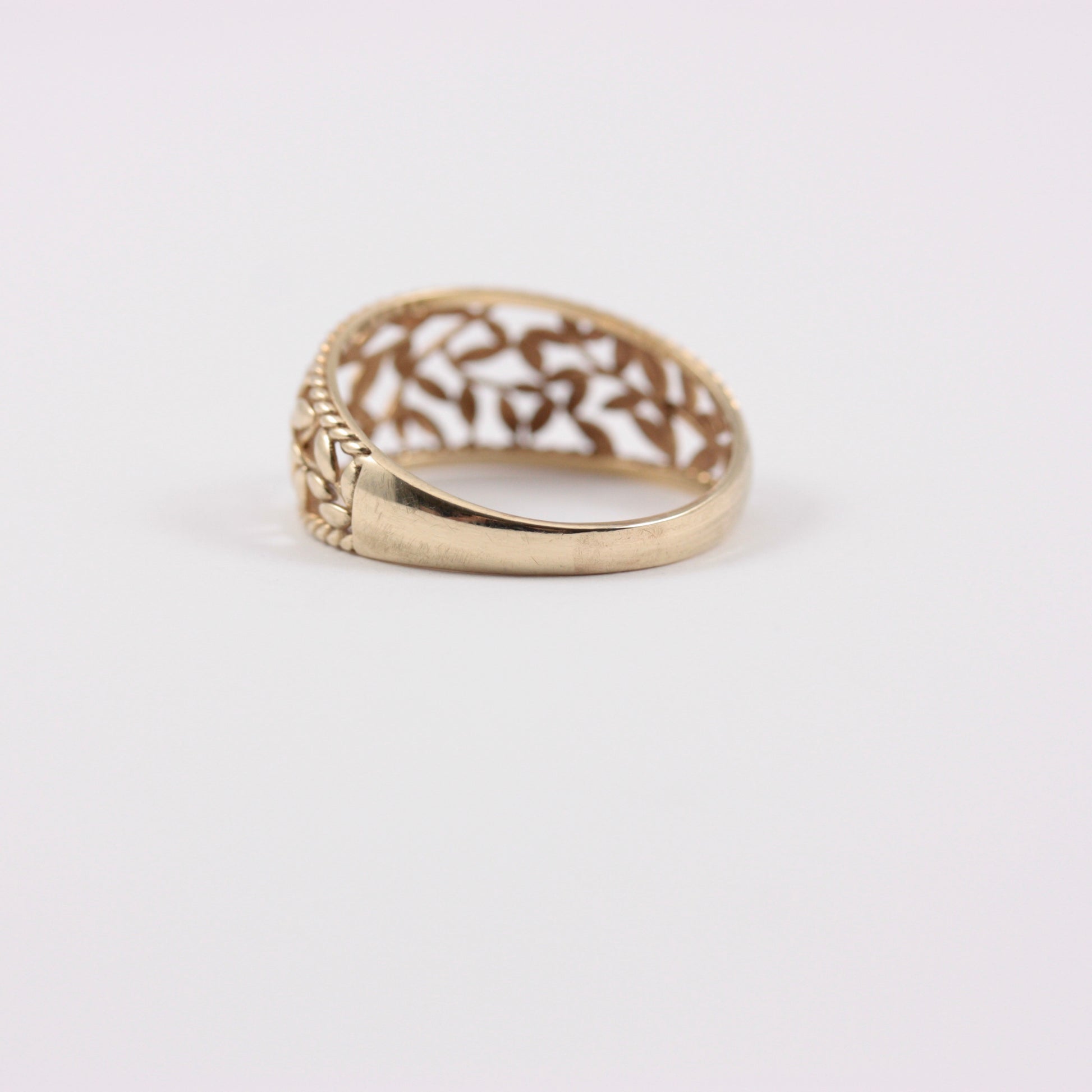 A lovely 9ct gold band style ring in open foliate design, with a subtle domed shape to the front and delicate rope detail to the edges.