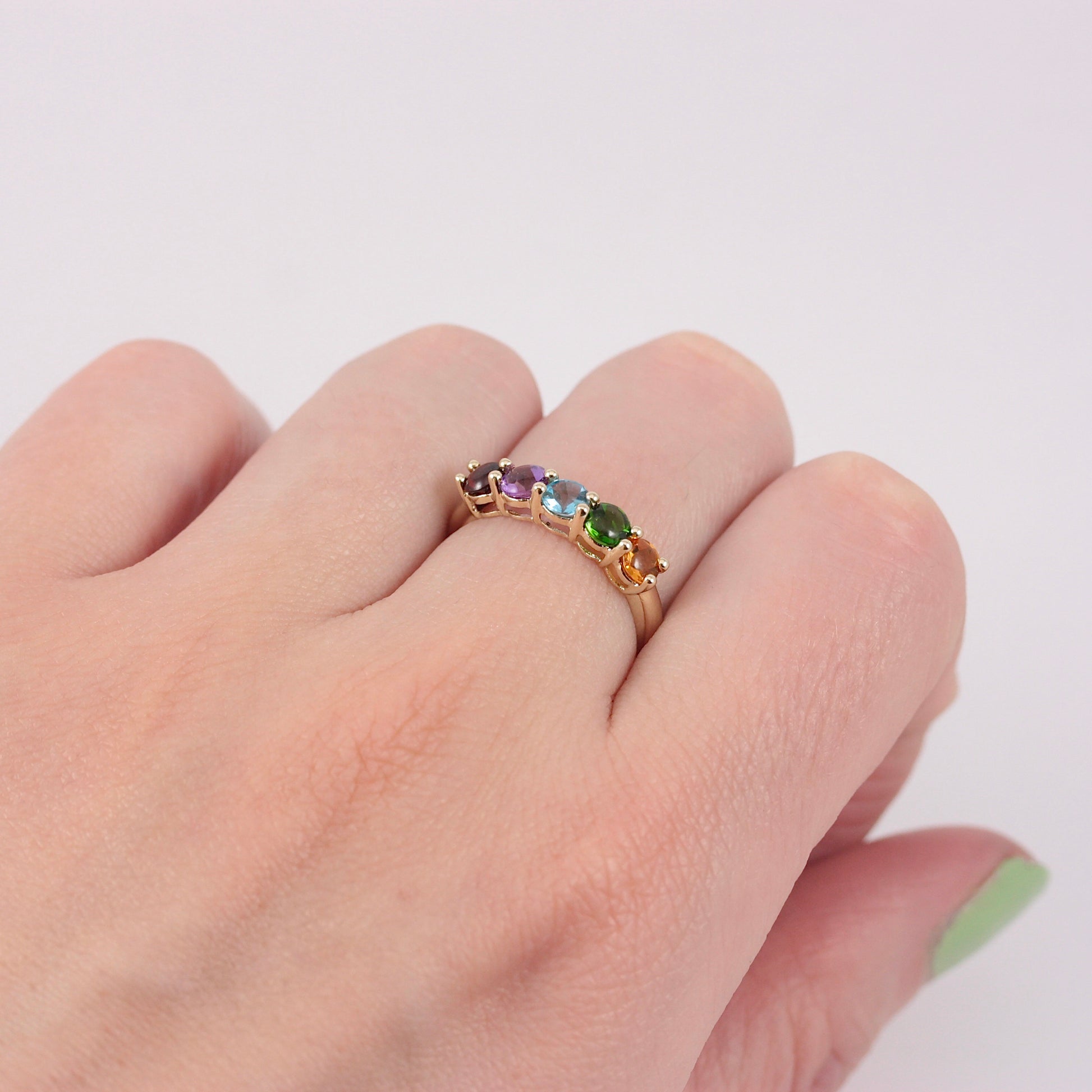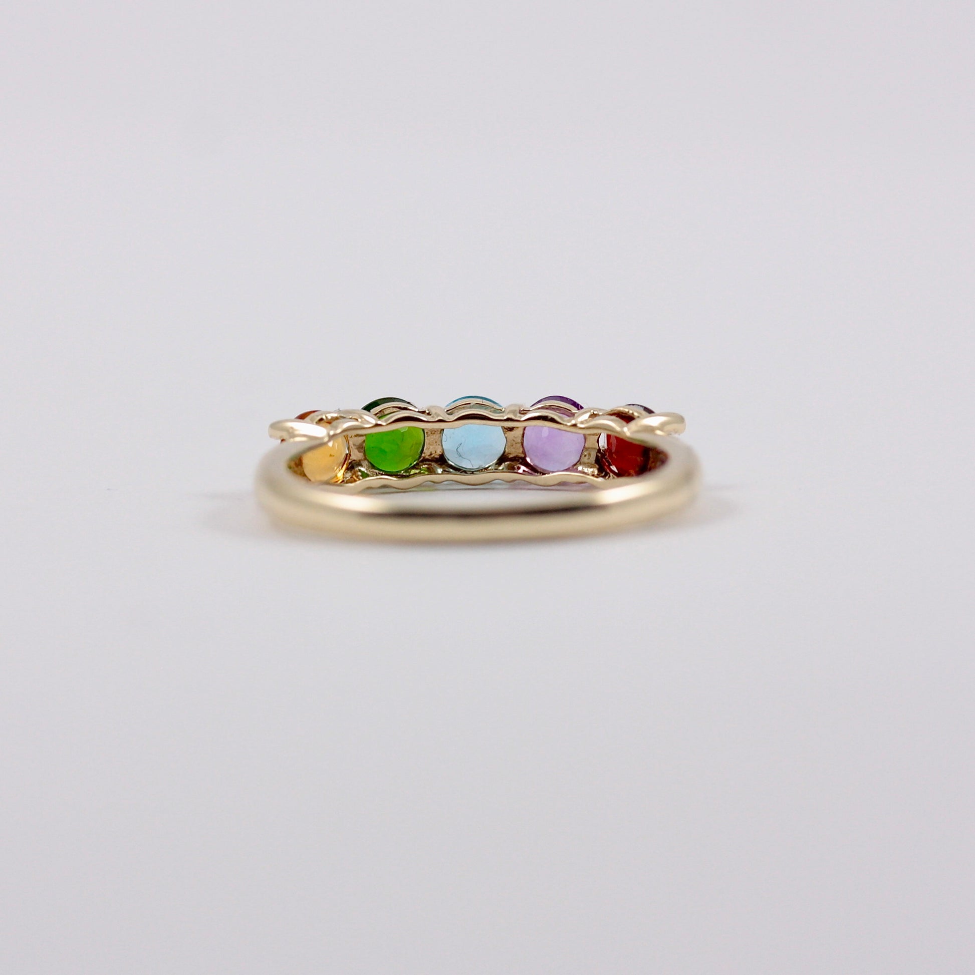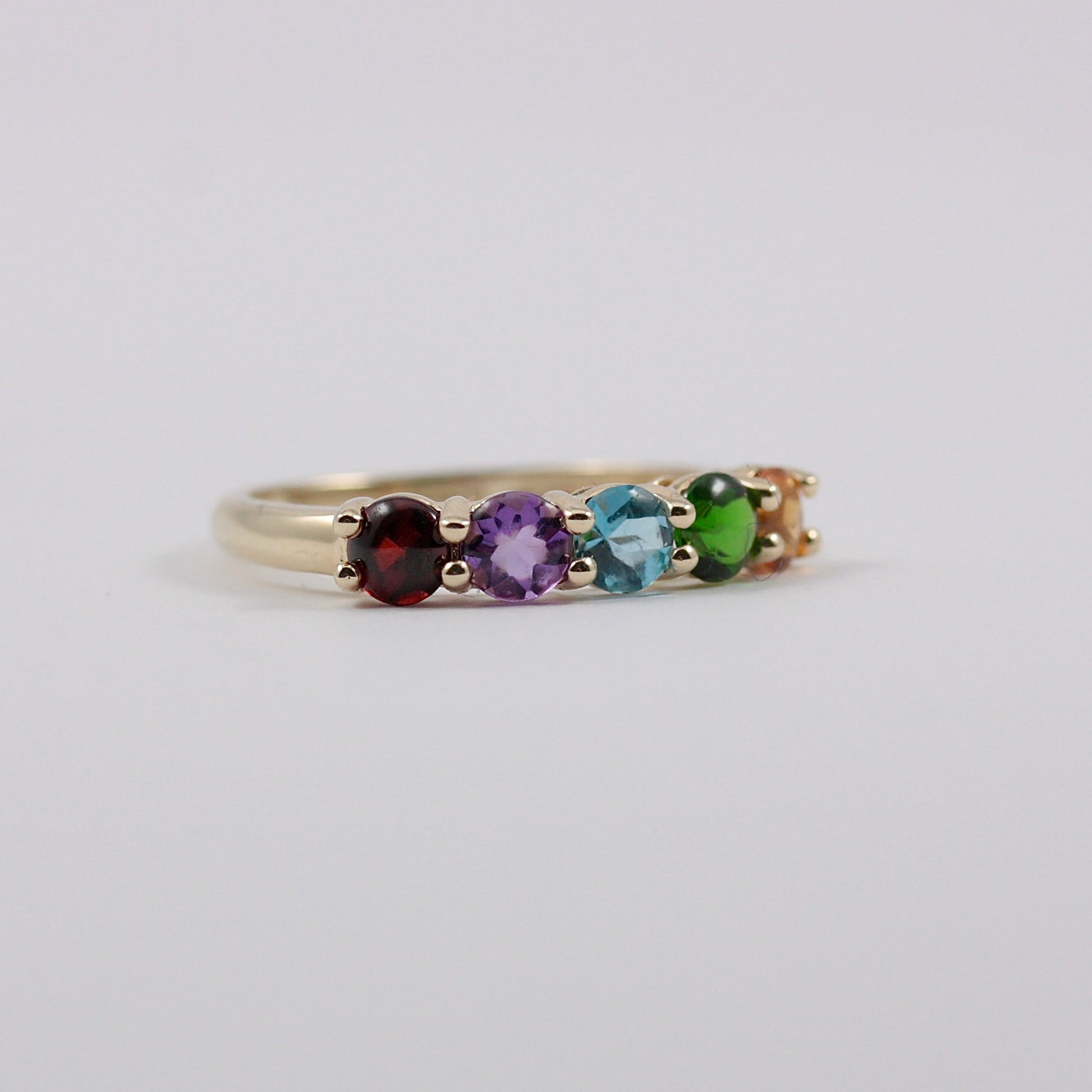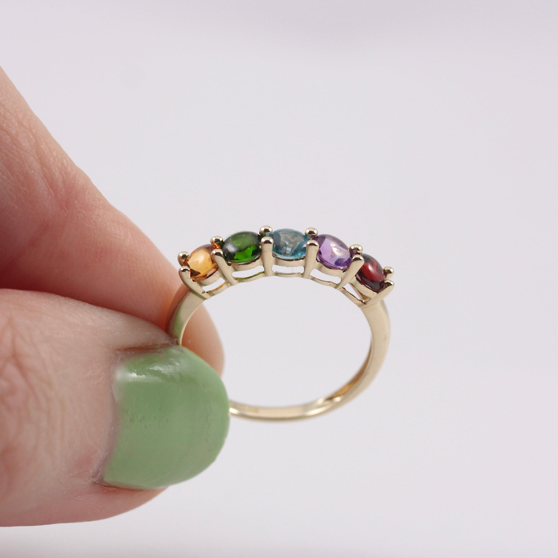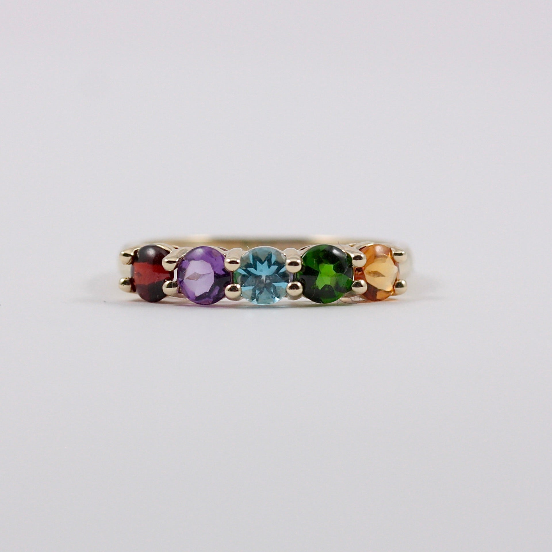 A modern solid 9ct gold 5 stone ring with garnet, amethyst, blue topaz, peridot and citrine. The stones are buff top cut - rounded cabochon to the top and faceted to the bottom.