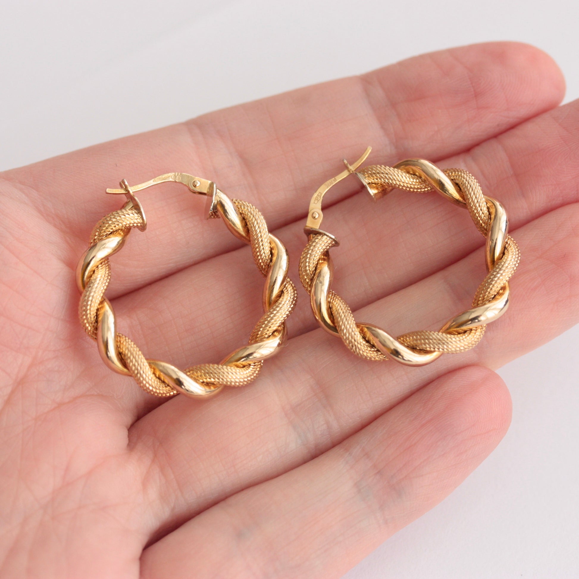 A gorgeous pair of 9ct yellow gold rope hoop earrings, with intertwining smooth and textured strands.