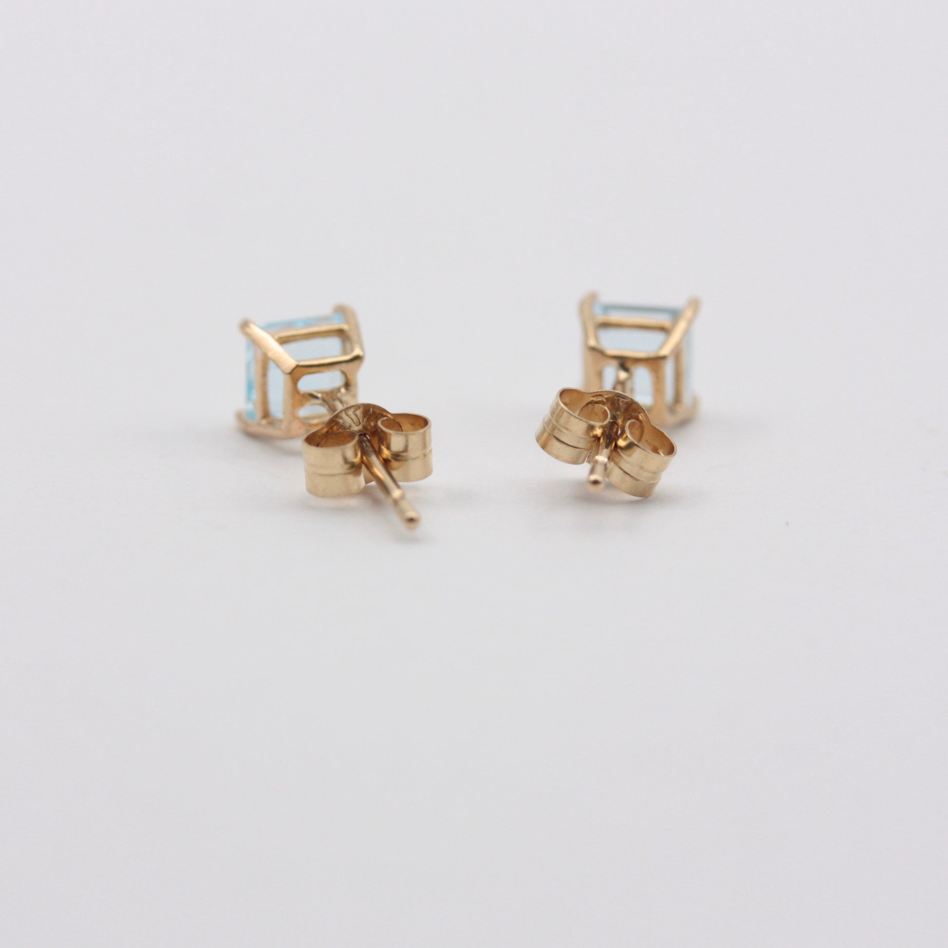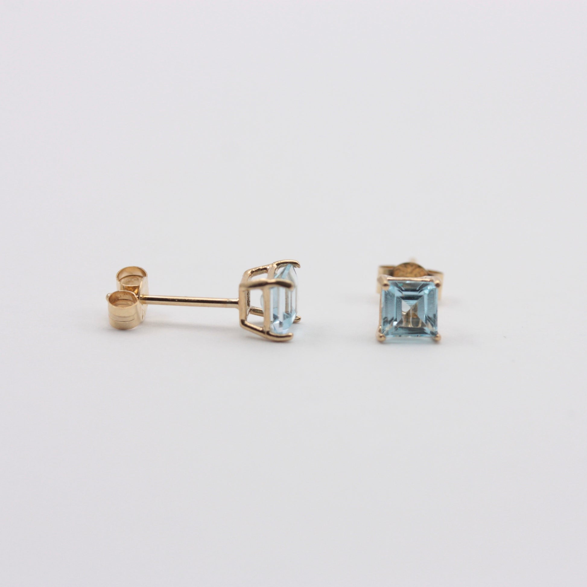 A pair of solid 9ct yellow gold stud earrings with pale blue topaz stones.