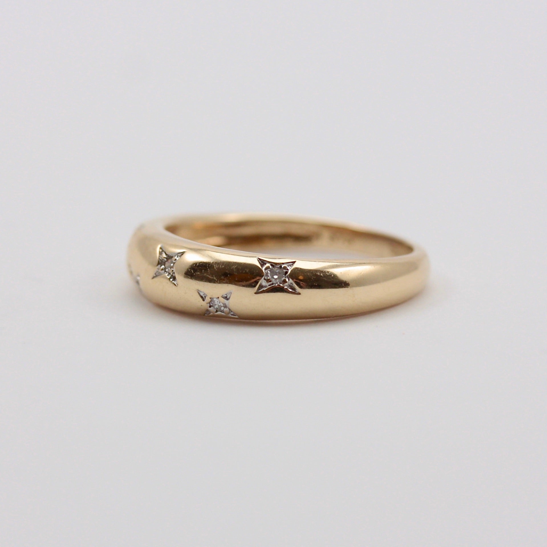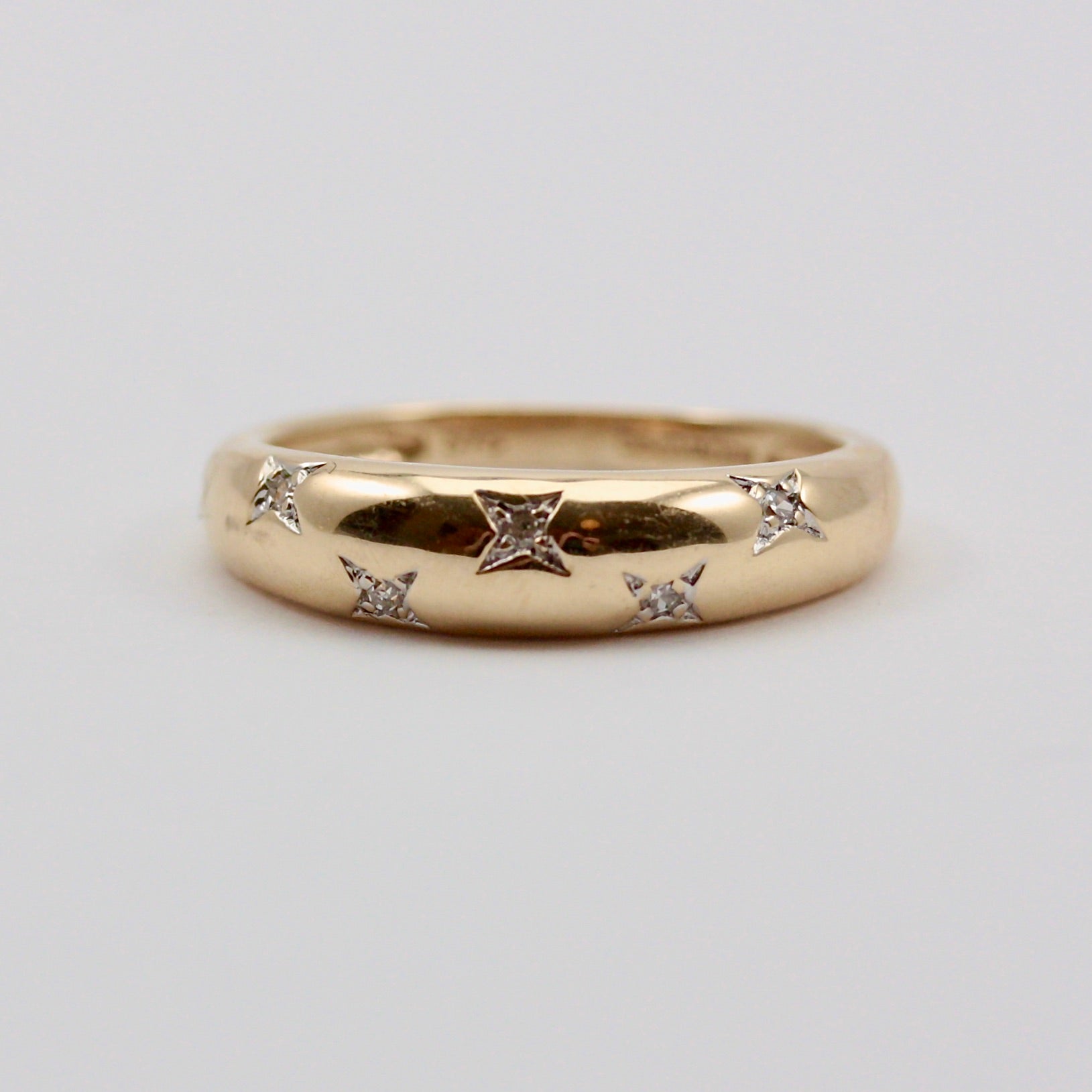 A lovely solid 9ct yellow gold ring, subtly domed to the front and star set with diamonds.