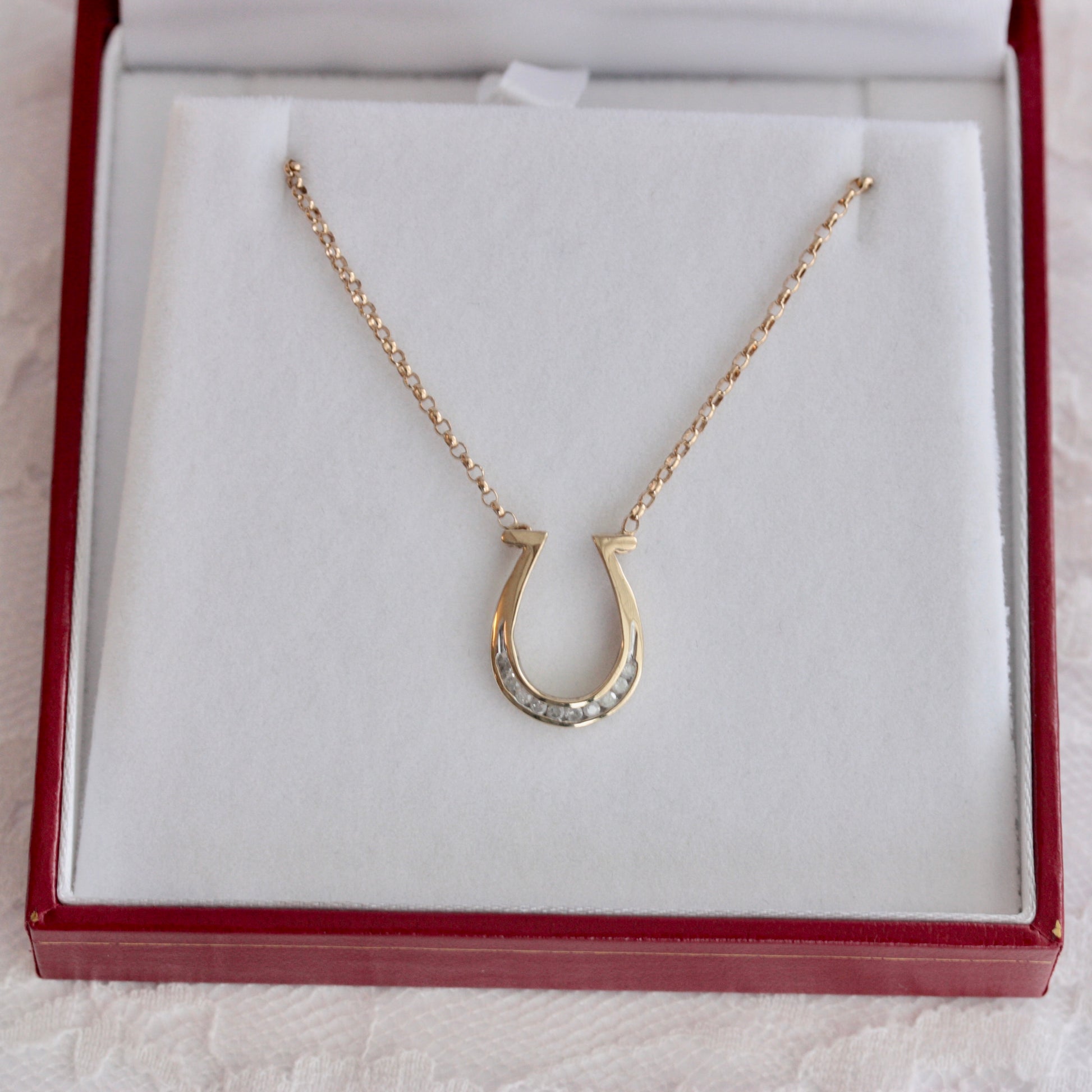 A gorgeous 9ct yellow gold horseshoe necklace, set with 10 small diamonds and strung on a fine belcher chain.