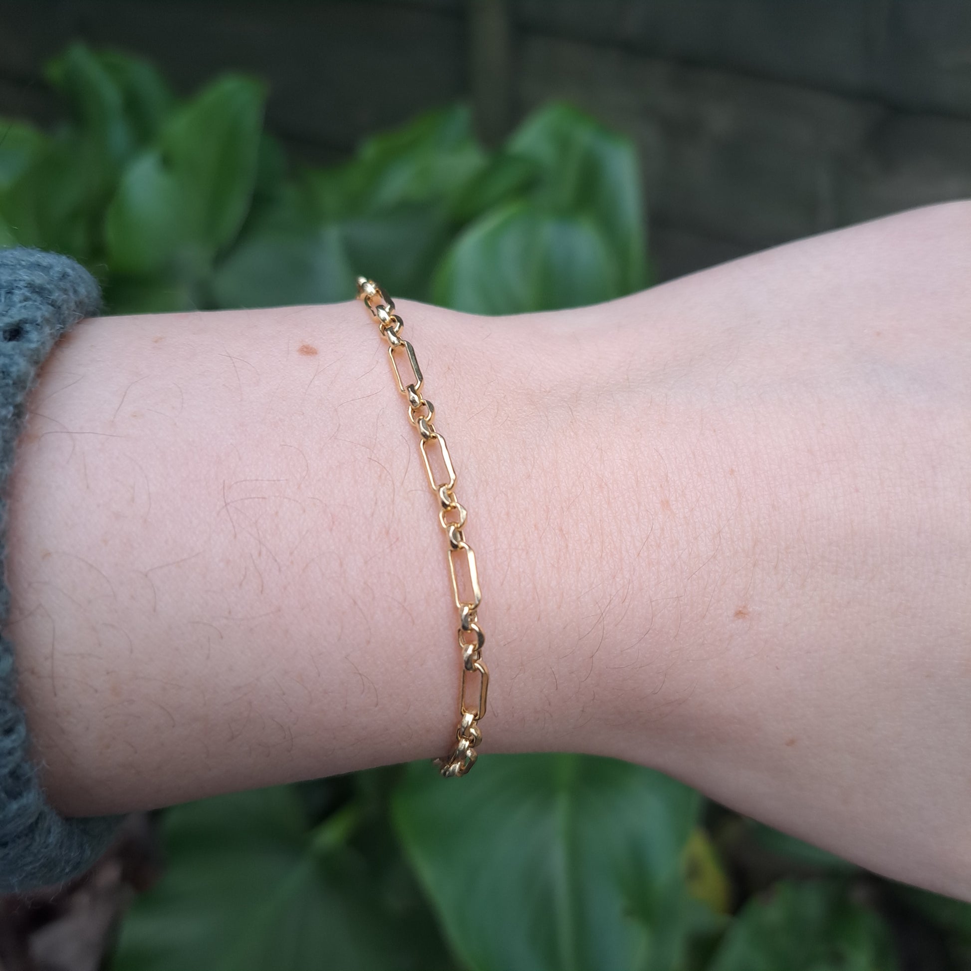 A 9ct yellow gold bracelet with alternating long and short square links, in a style similar to a figaro chain.