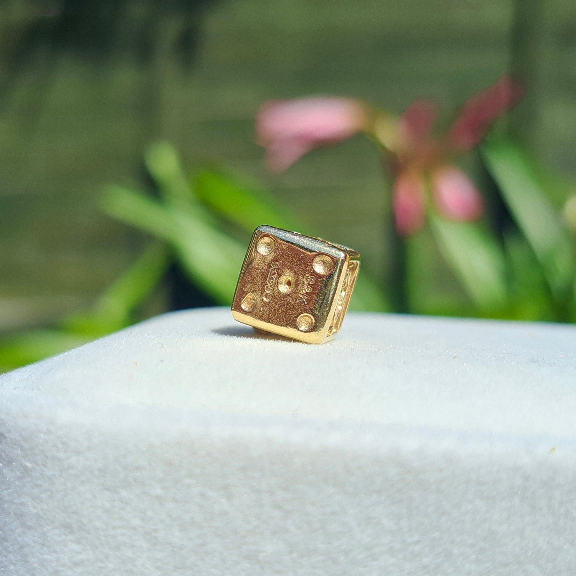 A very rare (we've never seen one in the 8 years of our business!) 9ct gold charm in the design of a dice with spots to top and bottom. The other 4 sides have an openwork design and feature images of the four suits (hearts, spades etc). The box / dice opens to reveal "four of a kind" Ace playing cards inside.