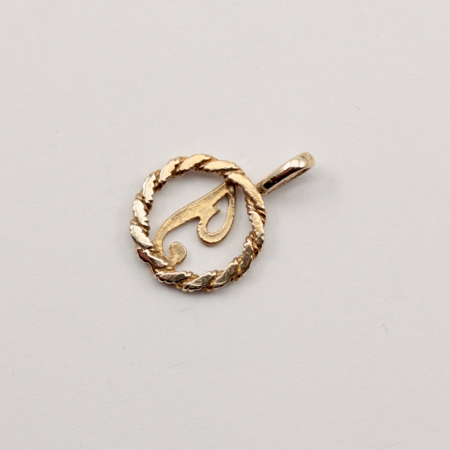 A 9ct yellow gold letter J pendant with rope design detail.