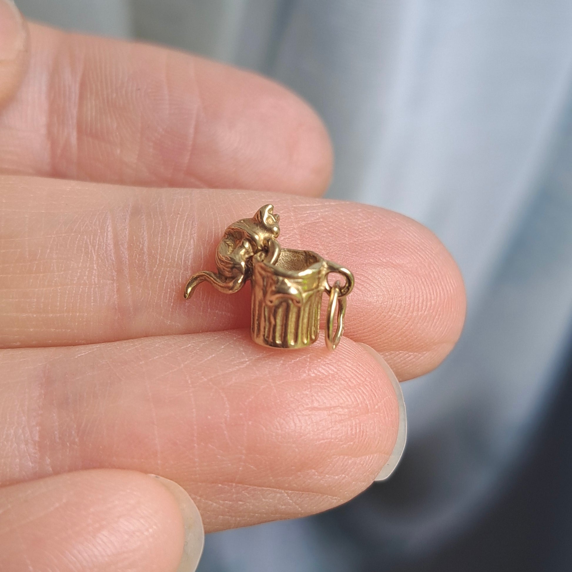 A super cute 9ct gold teeny charm featuring a moveable cat who is raiding the bin!