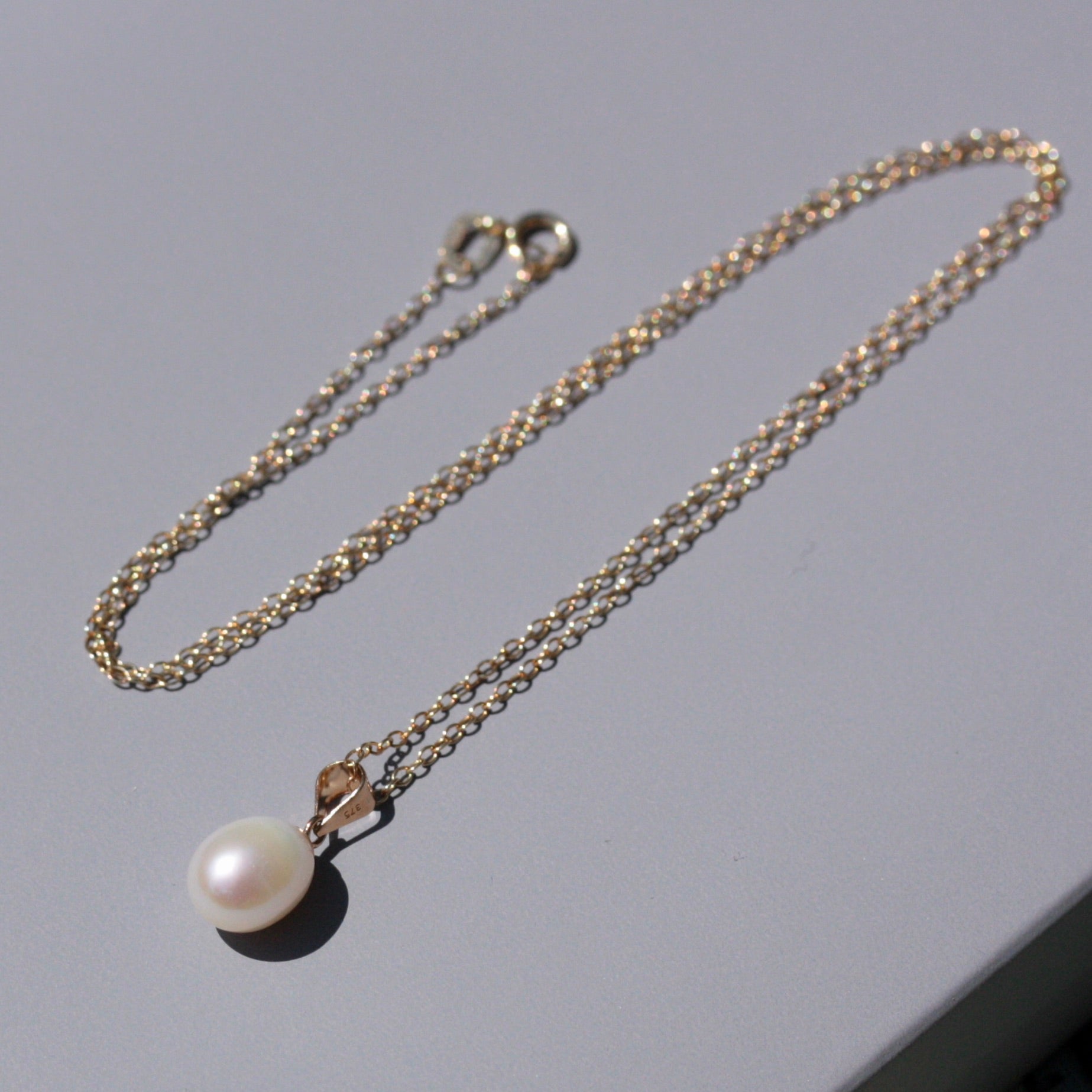 A solid 9ct yellow gold pendant with teardrop shaped freshwater pearl.