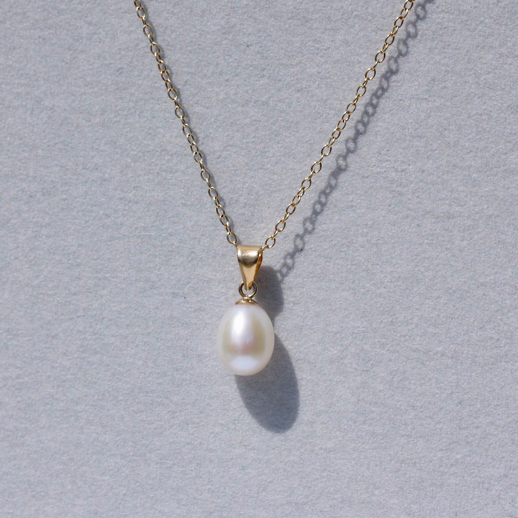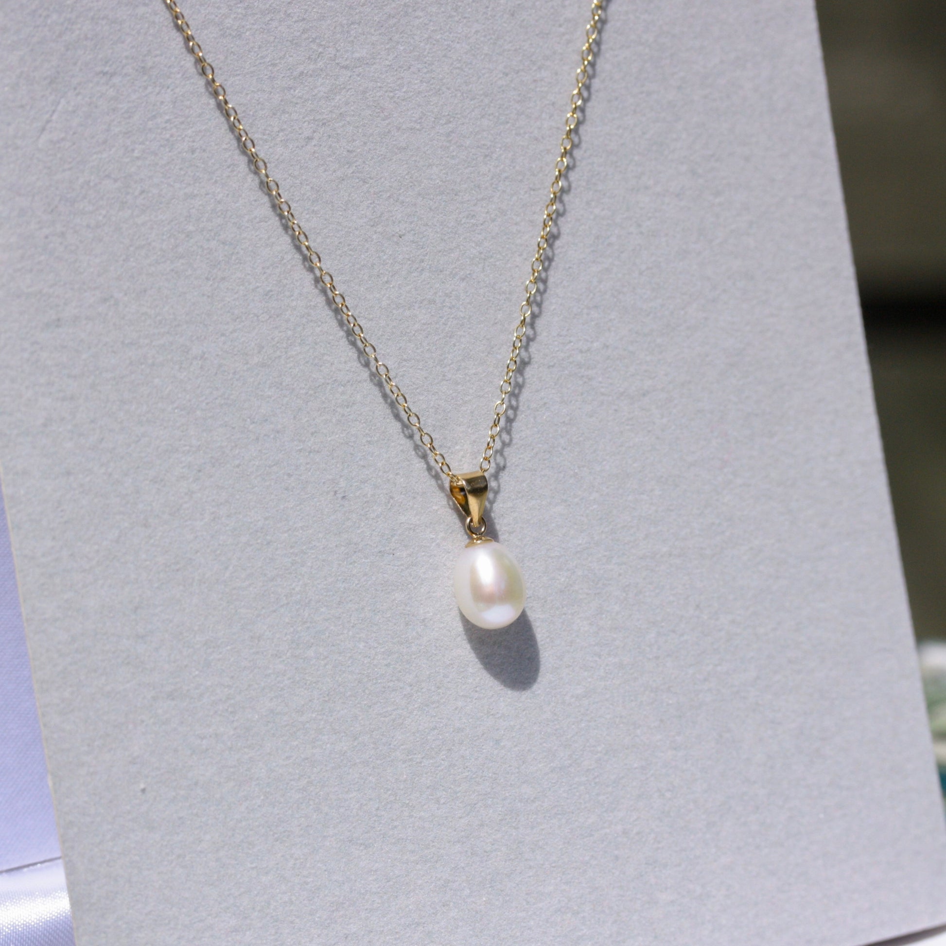A solid 9ct yellow gold pendant with teardrop shaped white freshwater pearl.