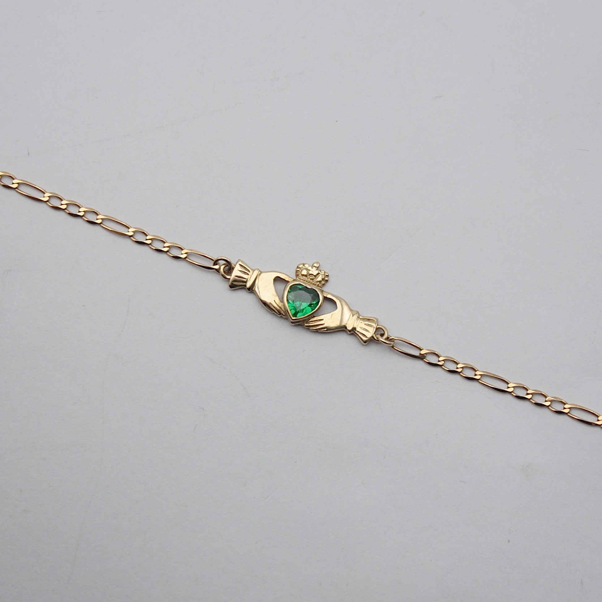 A solid 9ct yellow gold claddagh bracelet with fine figaro chain and green cubic zirconia heart.