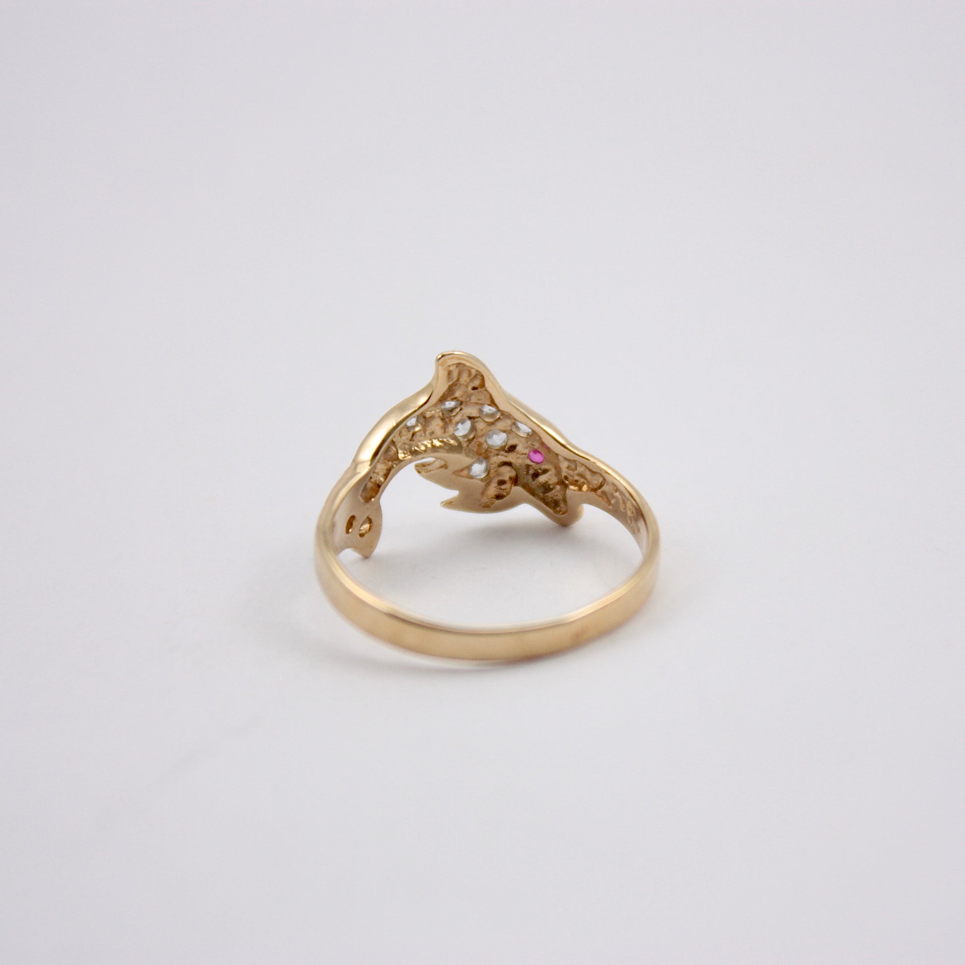 A solid 9ct yellow gold dolphin ring with clear cubic zirconia and a ruby eye.
