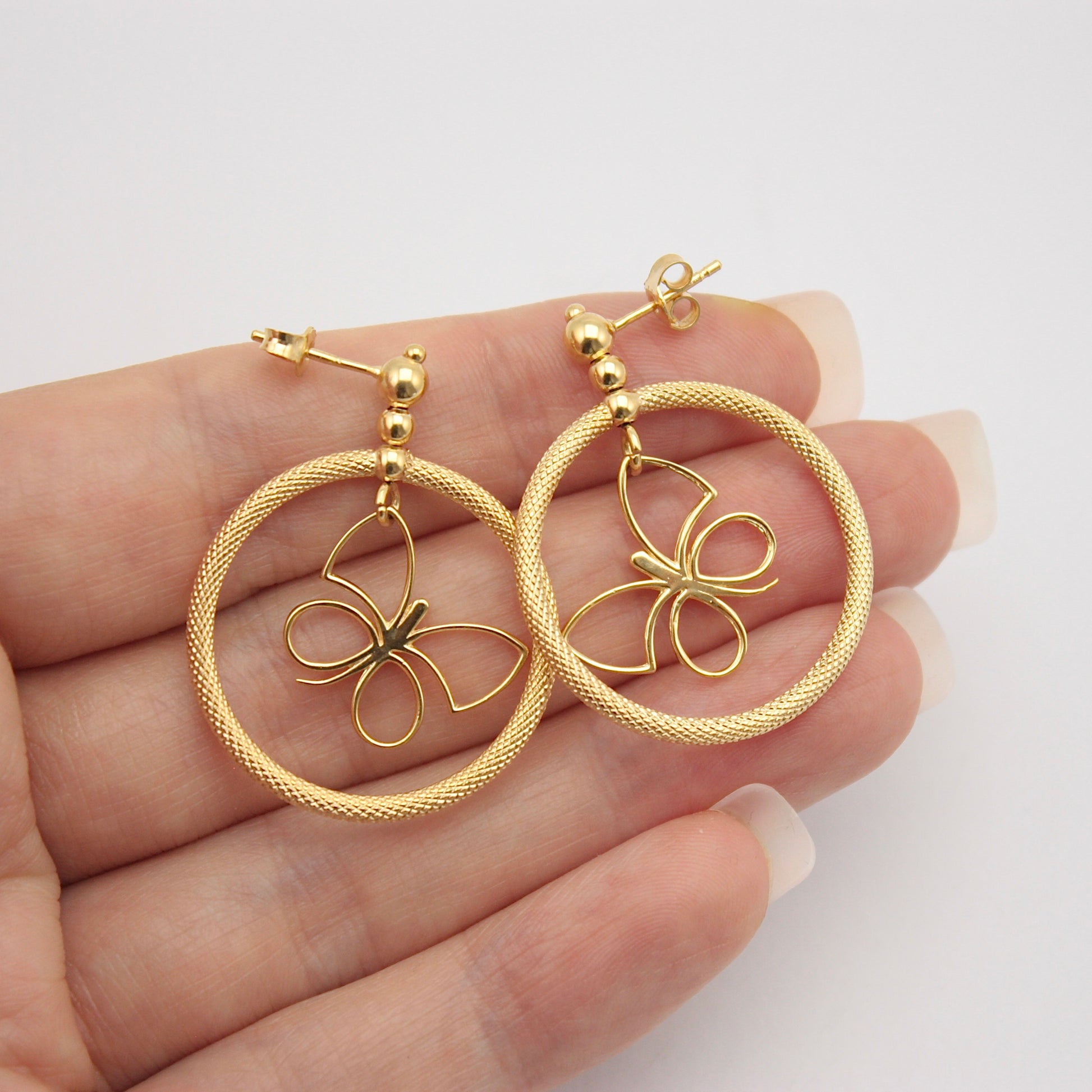 A pretty pair of solid 9ct yellow gold textured dangle hoop butterfly earrings.