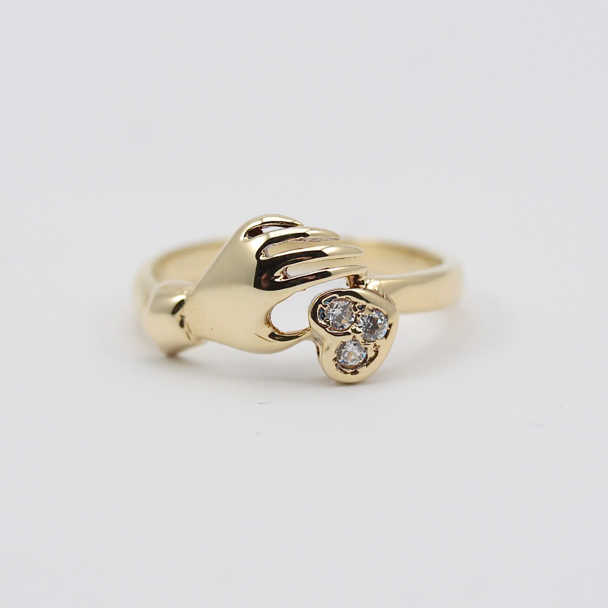 Vintage 14ct Gold Hand Holding Heart White Stone Ring